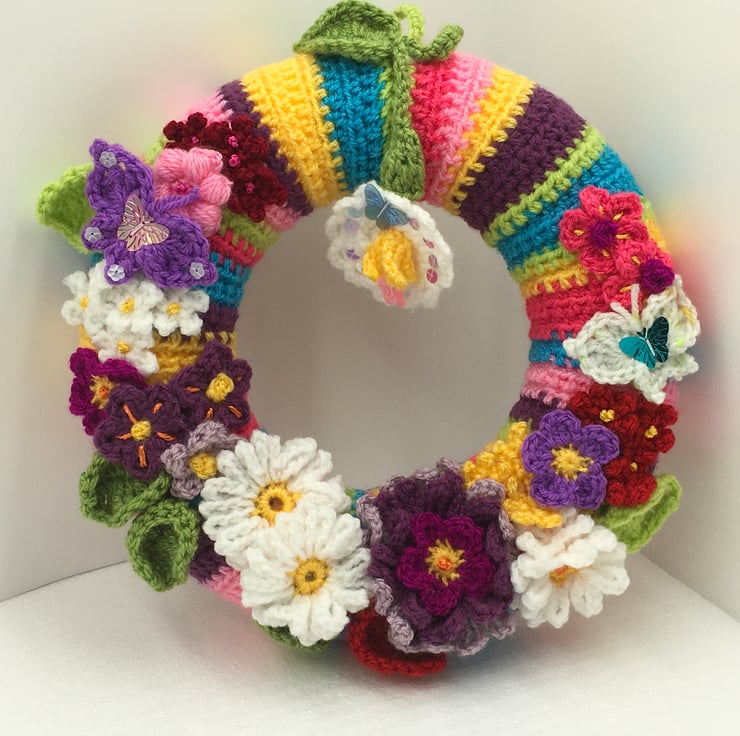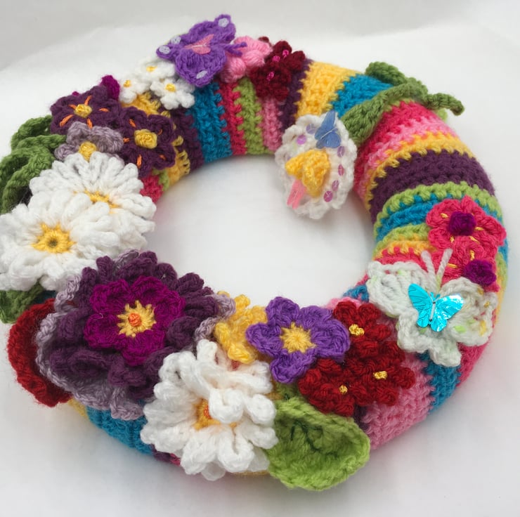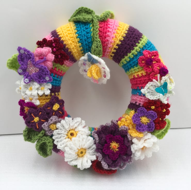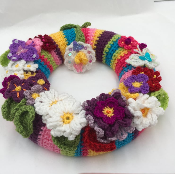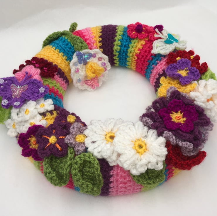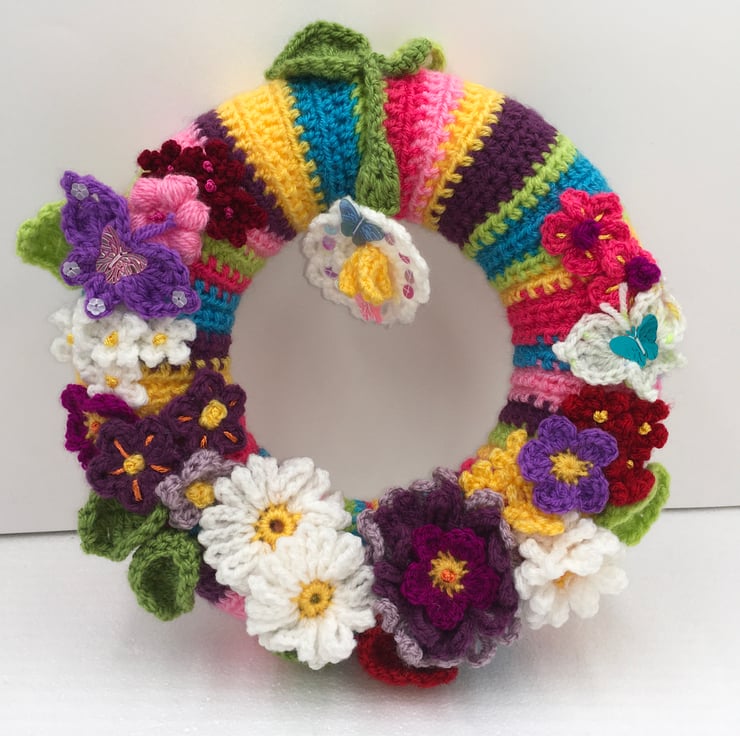 Spring into Summer with this Cheerful Wreath Full of Crocheted Pretty Flowers.