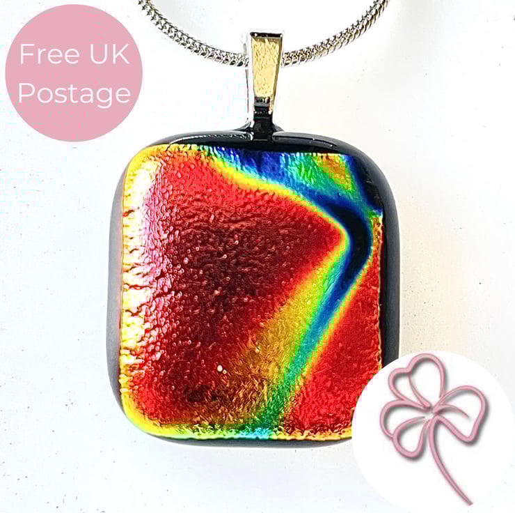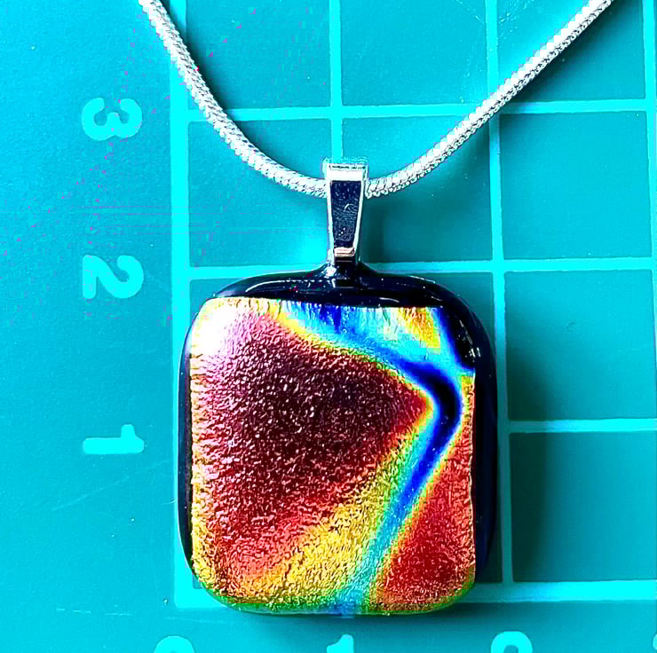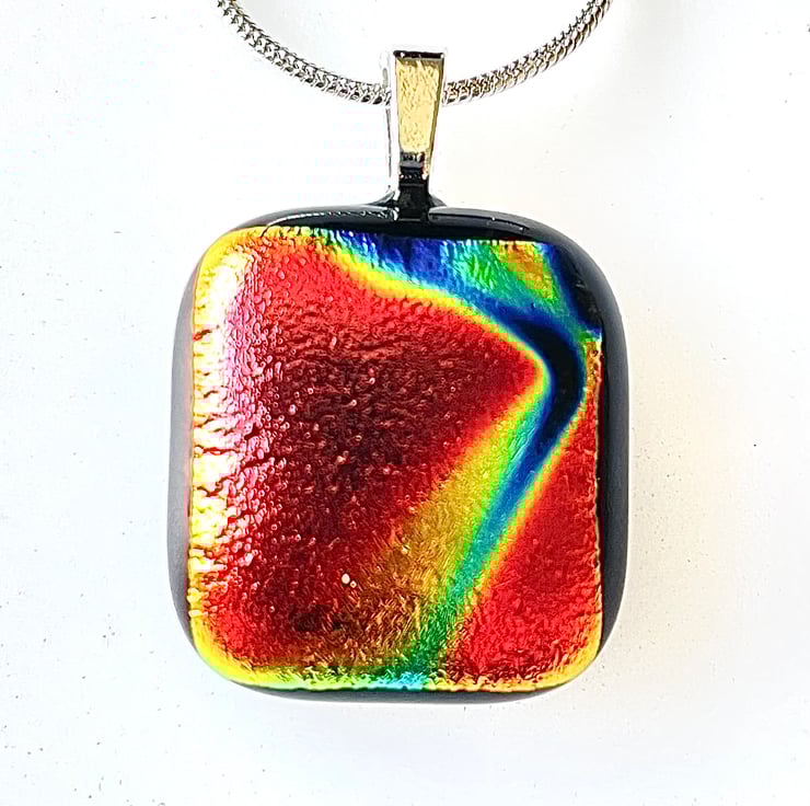 This hand-cut fire red and rainbow glass pendant was made by fusing a layer of patterned dichroic glass to a black base layer to create this stunning multicoloured shimmering pendant. The shimmer is a matt finish rather than glossy. It was fired at 800 degrees Celsius in a specialist glass kiln and gently cooled over a 12 hour period. A silver plated jewellery bail was glued on to the back to hang it on either a silver plated snake chain or black cord. It measures approximately 19mm square.