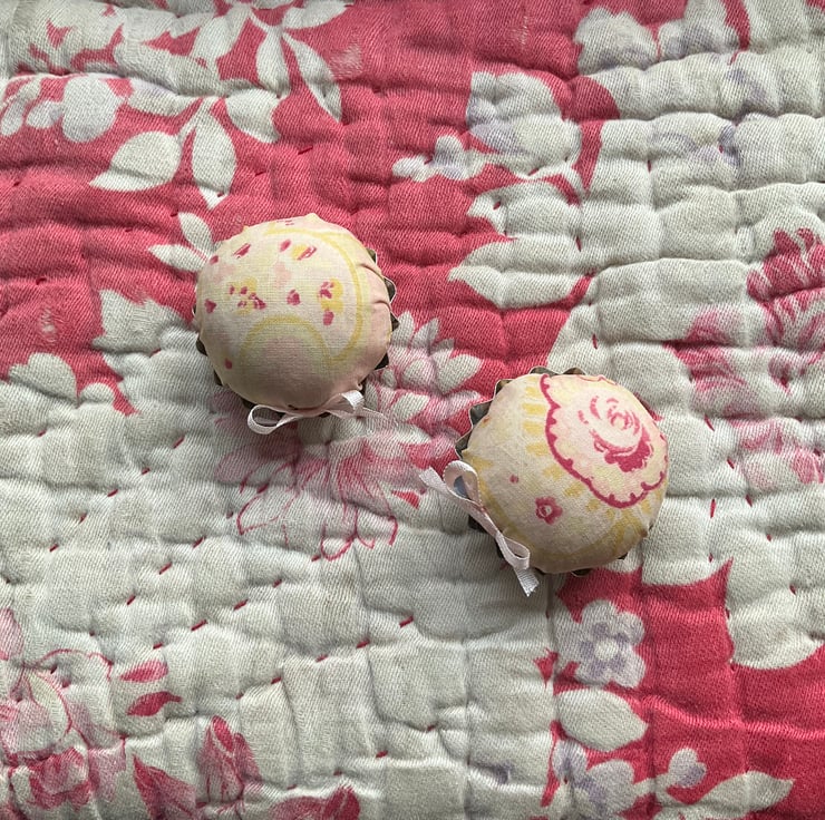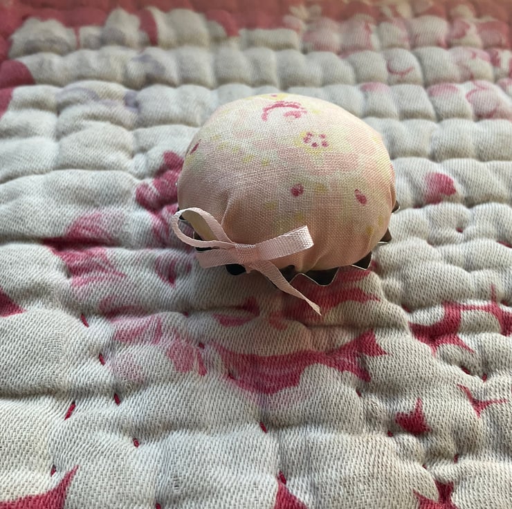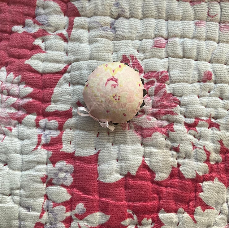Pin cushion is made from a gorgeous vintage printed fabric, trimmed a silk bow.