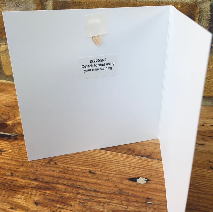 The mini hanging is 7.5 cm square mounted on a 15 cm quality square white card.