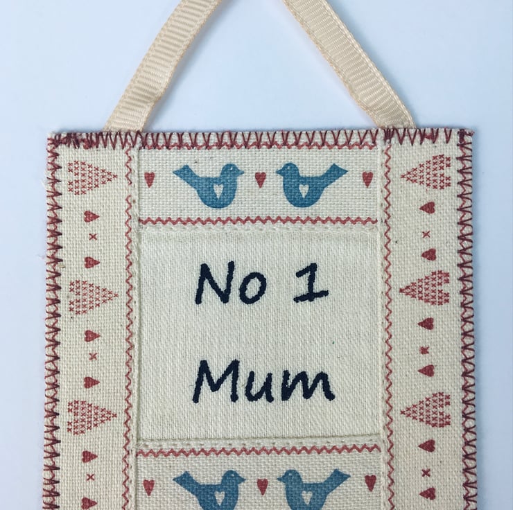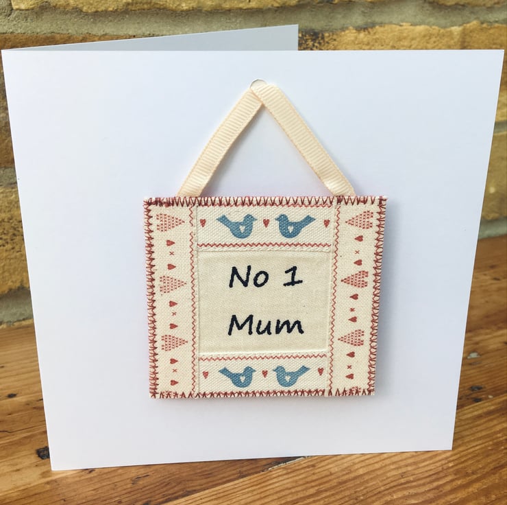 This special card has a decorative mini hanging with the personalised message ‘No 1 Mum’ which can be detached and kept as a keepsake to cherish. This beautifully crafted handmade fabric mini hanging is bordered with hearts and love birds.
