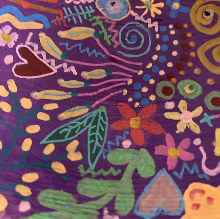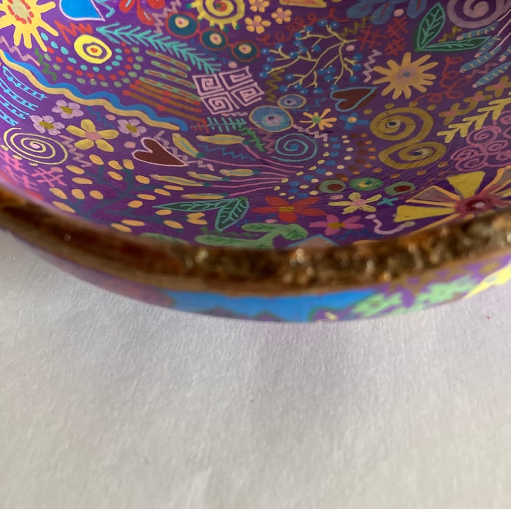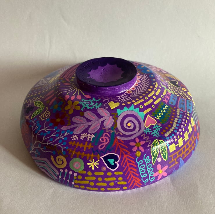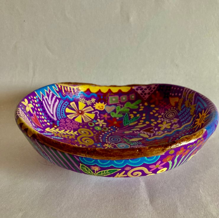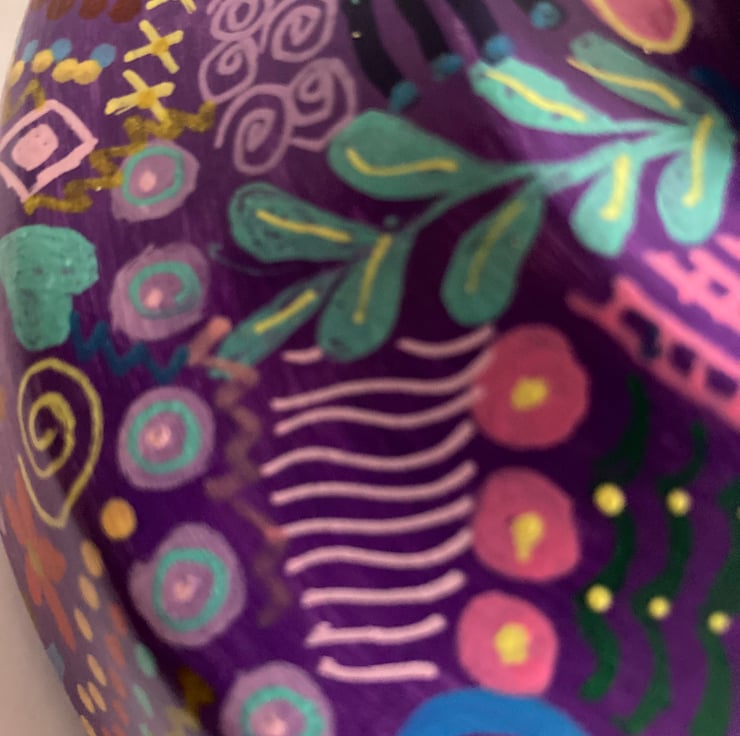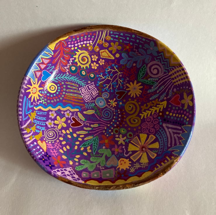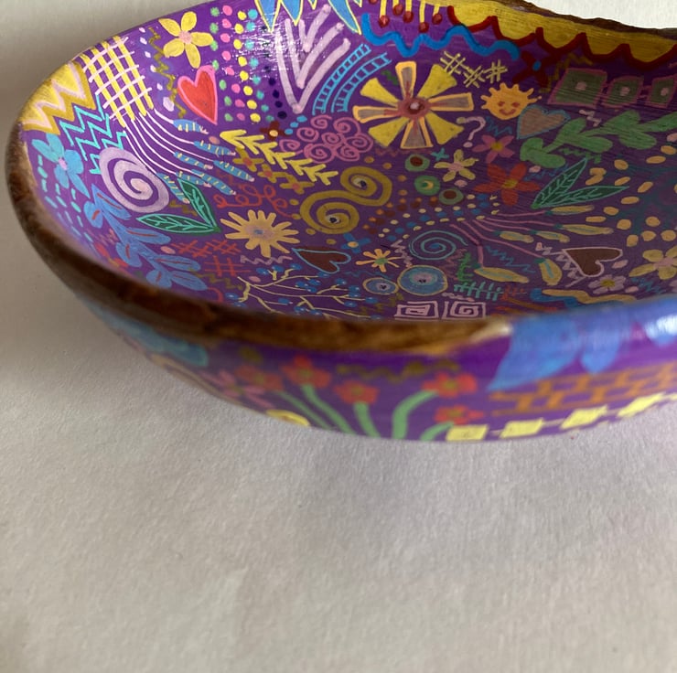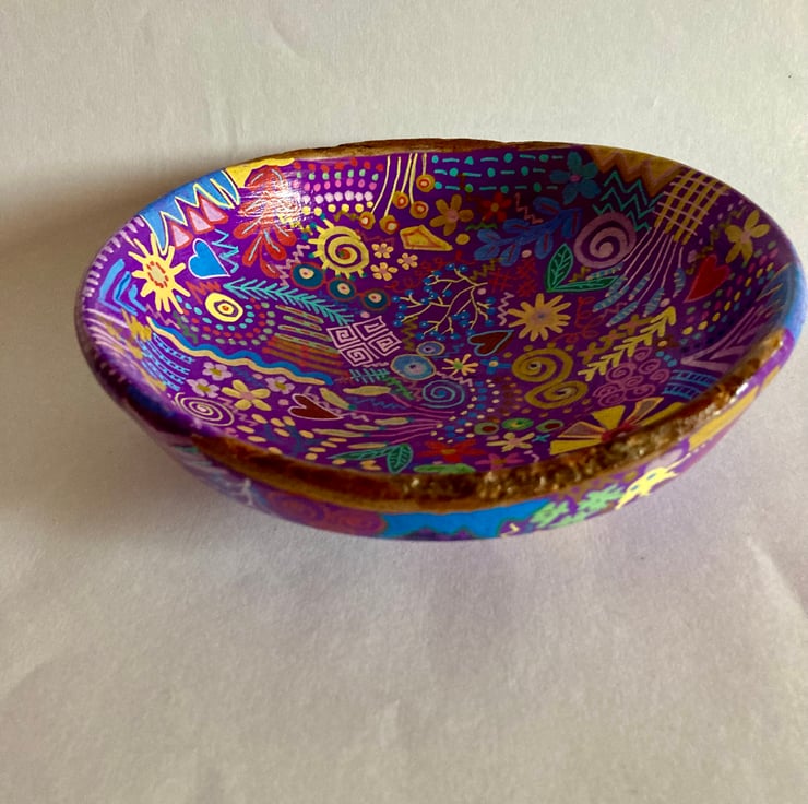 Another rescued wooden bowl which had been cleaned up and given a bright colourful future. I have lavished it with colourful doodles and varnished to finish