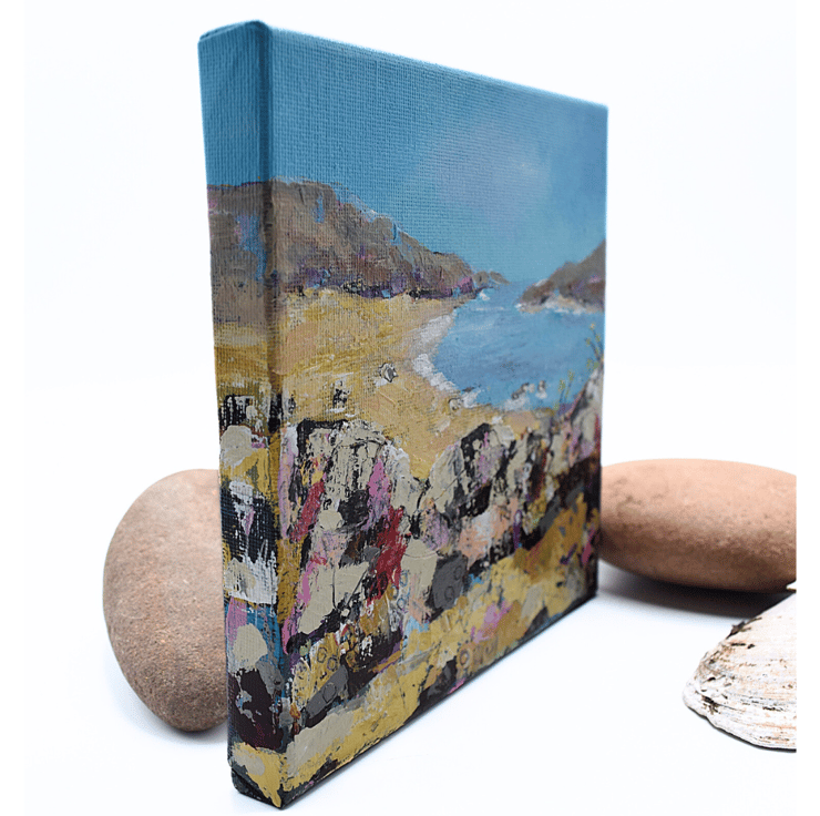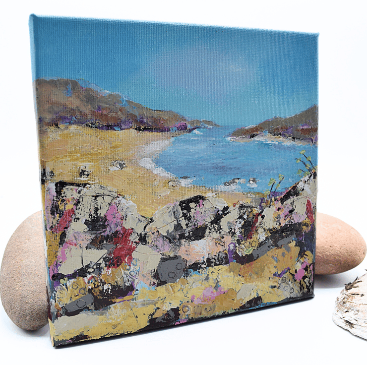 This acrylic painting of a beach in Scotland, is ready to hang. I've applied thick layers of paint using various sized brushes and palette knives to create a tactile texture on the surface of the canvas. The clear blue sky stretches over the coast, and the sea is tranquil, reflecting the blue and pink hues in the sky. The hills in the distance catch the sunlight, and the foreground is filled with craggy rocks that contrast with the soft golden sands.