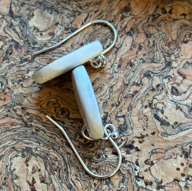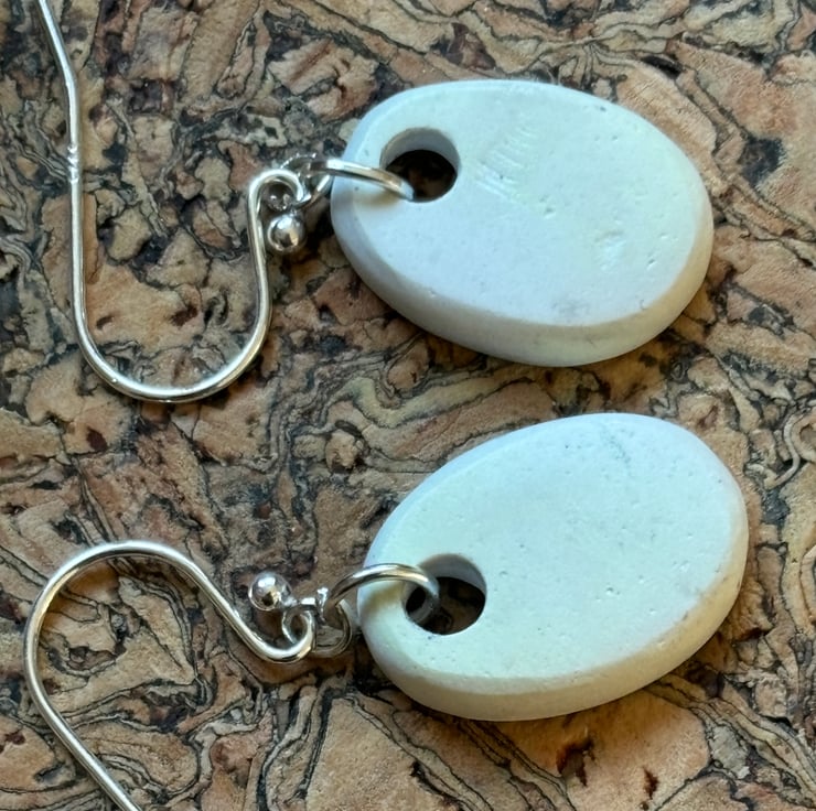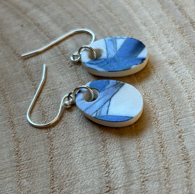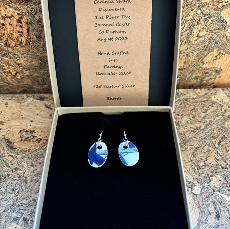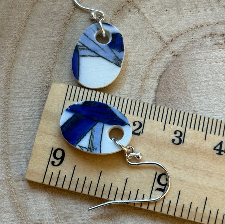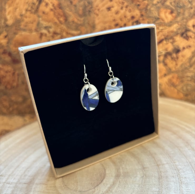I found a striking piece of blue and white ceramic, part of a chunky rim. I like to allow the shape of the ceramic to suggest what can be created with it so I thought I would clip the piece into a pendant. However, during this process it broke into two bits so I decided to create earrings. The shard was quite thick so I have filed and sanded the backs to thin the ceramic, there is a slight yellow tint to the backs, this is part of the make up of the ceramic, it’s age and journey. Front glaze in tact, sides and backs sealed with Eco Friendly sealant.