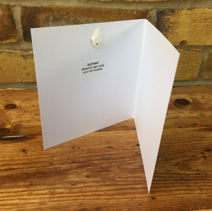 The mini hanging is 8 cm by 7 cm mounted on a 15 cm quality square white card.