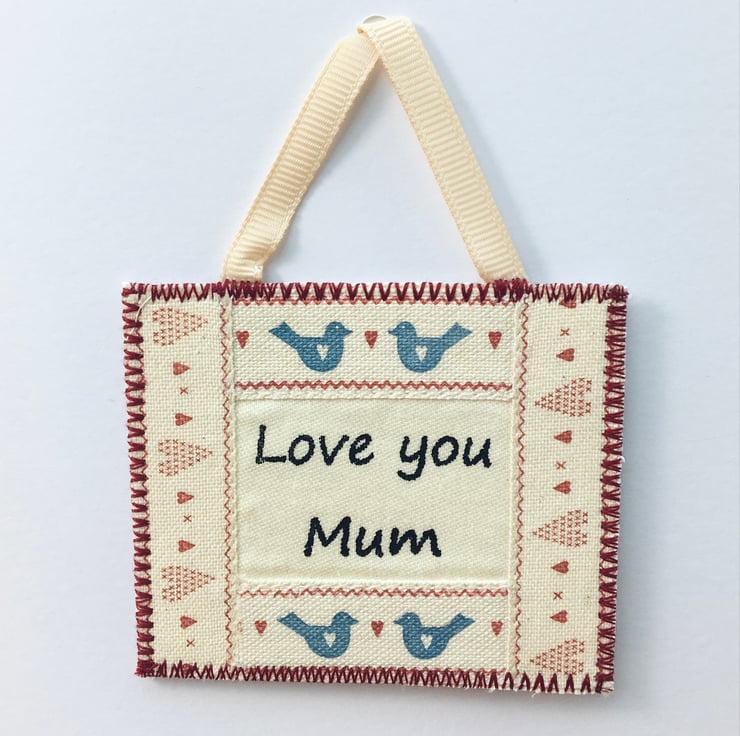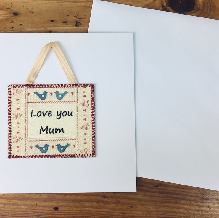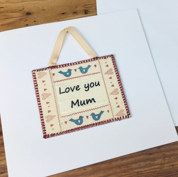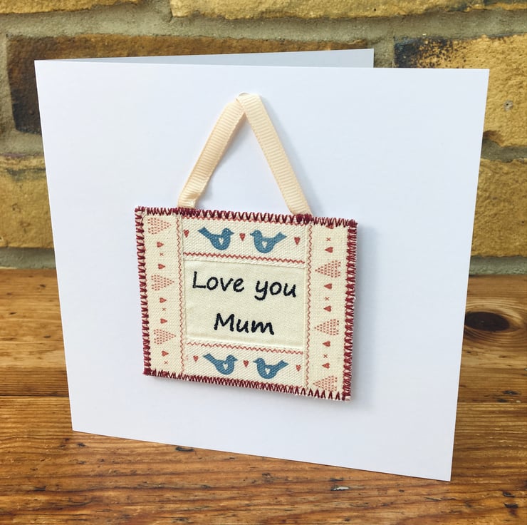 Perfect for your Mum's birthday, Mother's Day or to let her know how much she means. This special card has a decorative mini hanging with the personalised message ‘Love you Mum’ which can be detached and kept as a keepsake to cherish. This beautifully crafted handmade fabric mini hanging is bordered with hearts and sweet blue love birds.