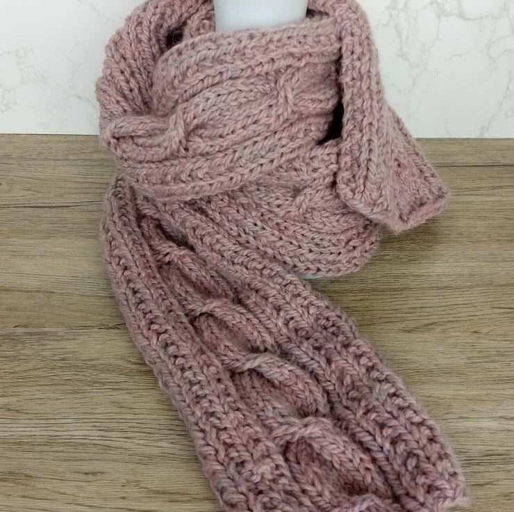 This supersoft cable knit wrap-around scarf in misty rose is made from a warm blend of superfine Alpaca and Peruvian Highland wool.