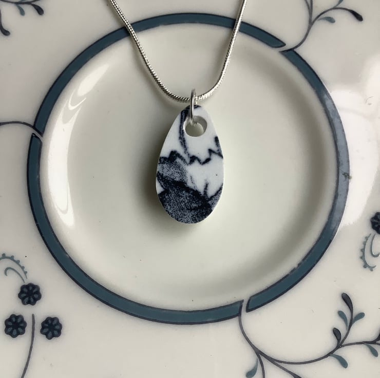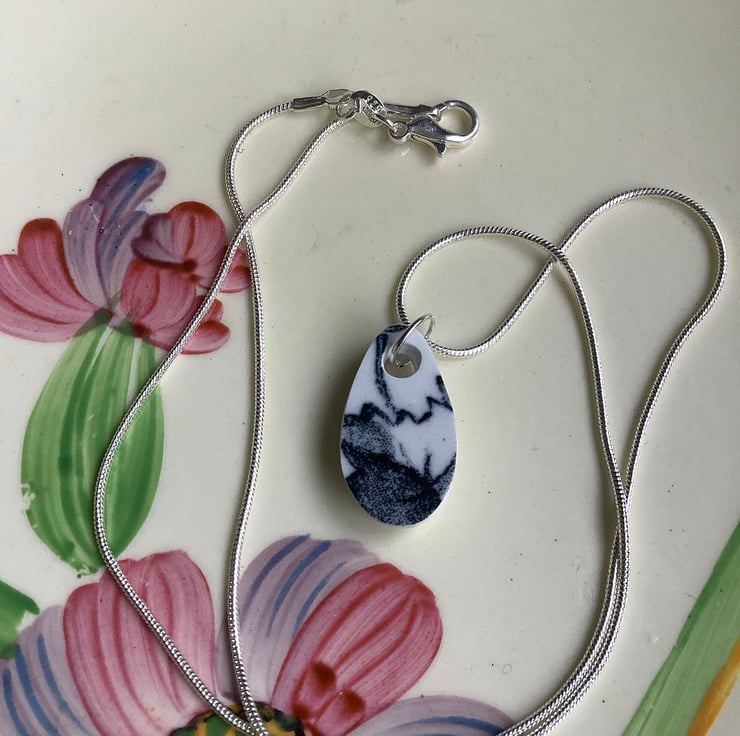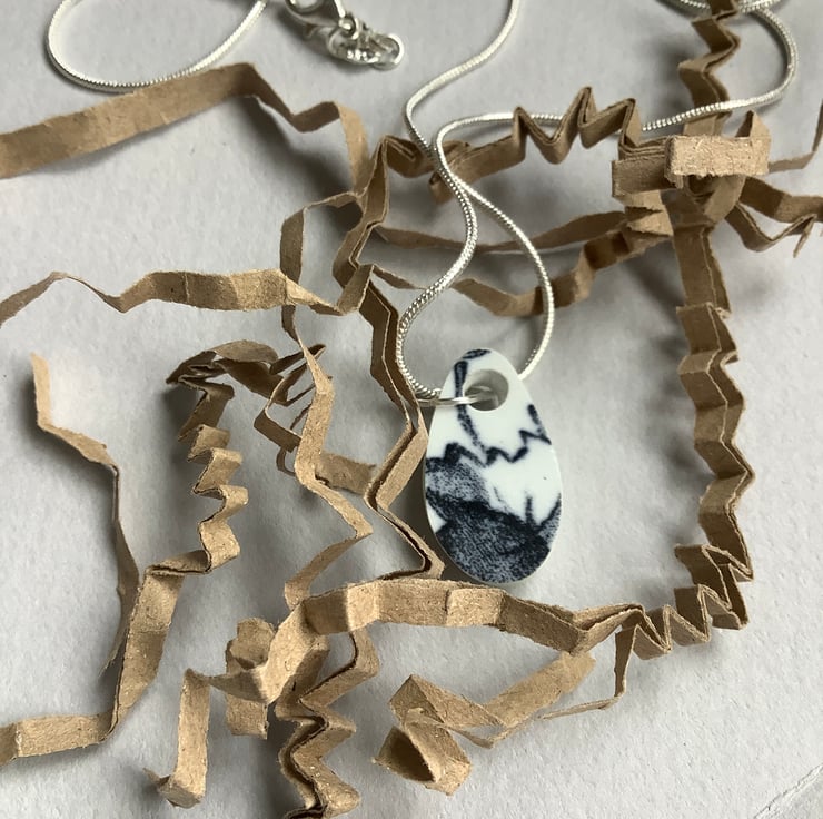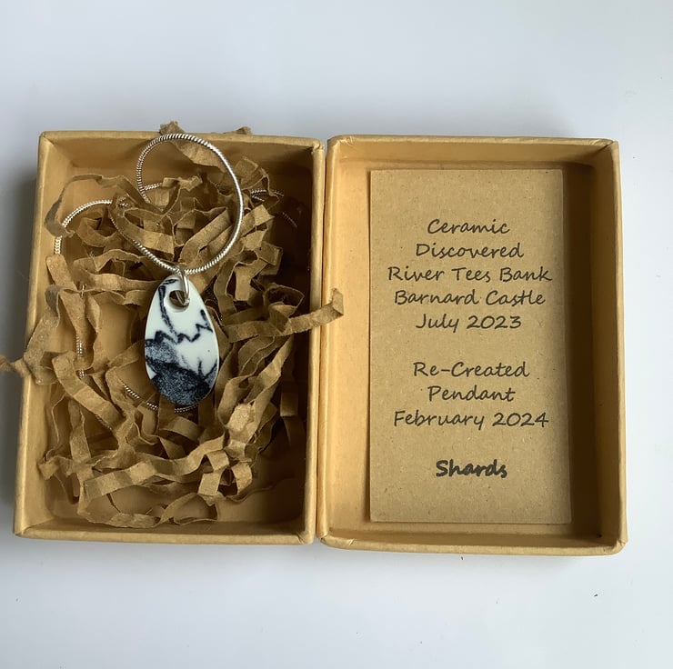 Hand crafted Jewellery and framed artworks using pre loved and discarded ceramics. Ceramic material will show signs of wear and damage. Entire process is a creative experience from discovery to final picture, nothing planned or preconceived. All materials personally collected from river banks, charity shops, roadside, woods, recycle centres, beaches, wherever dropped, dumped or donated ceramics are found, cleaned and shaped into new stories. Each piece comes with a short bio of where the ceramic came from, date found and re-created. Some shards collected are used as found, others are cut randomly which shape the final work. Every piece is individual, nothing replicated, however, due to repetitive patterns in ceramics there will be some similarity but only through the ceramic material not in the final piece.