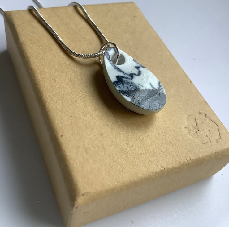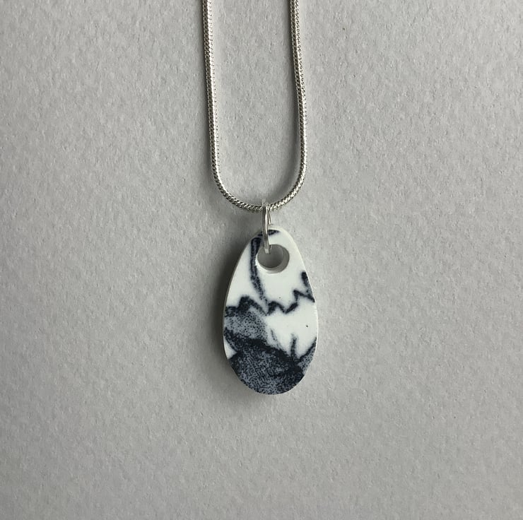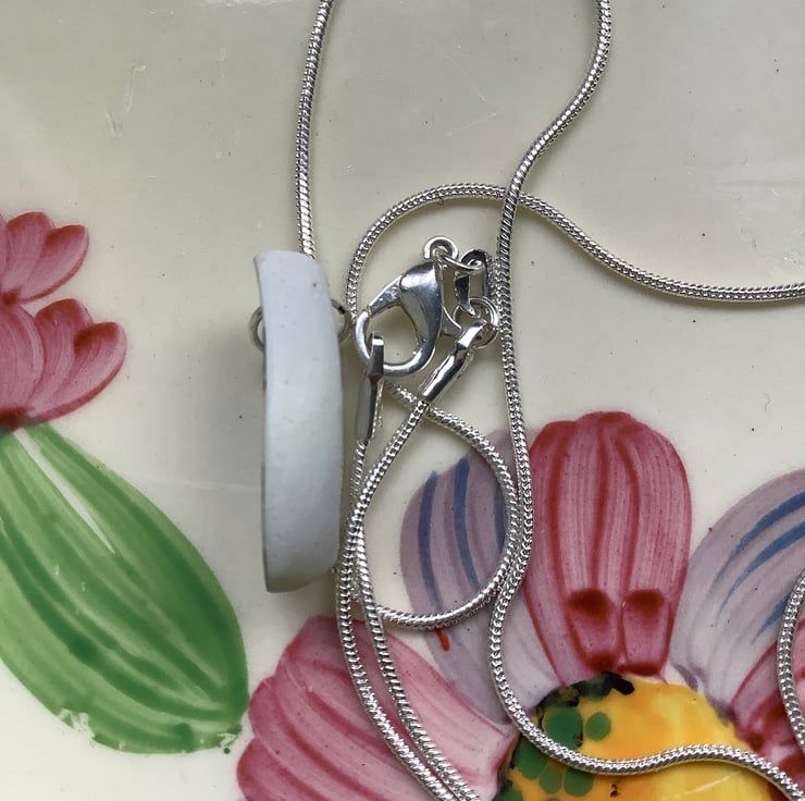 I found a lovely chunky shard of ceramic, sitting face up with a leaf pattern. After a thorough clean I gently drilled a hole and clipped the piece, I wanted to be able to preserve the pattern but unfortunately the ceramic broke. The shape the brake formed suggested an oval so I sanded into a pendant. There is a slight yellow tint to the side, this is part of the age, journey of the shard. Front and back glaze in tact, sides sealed with eco friendly non toxic matt sealant.