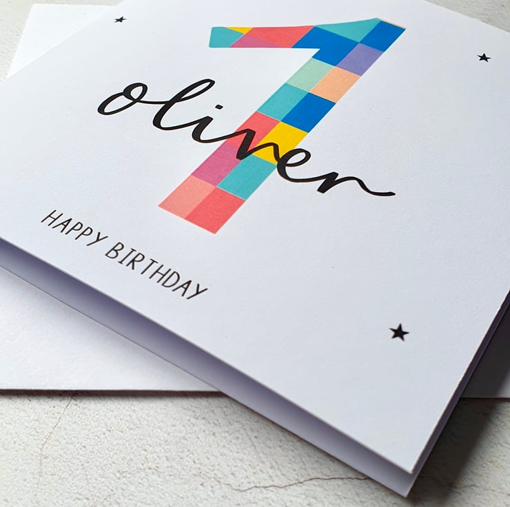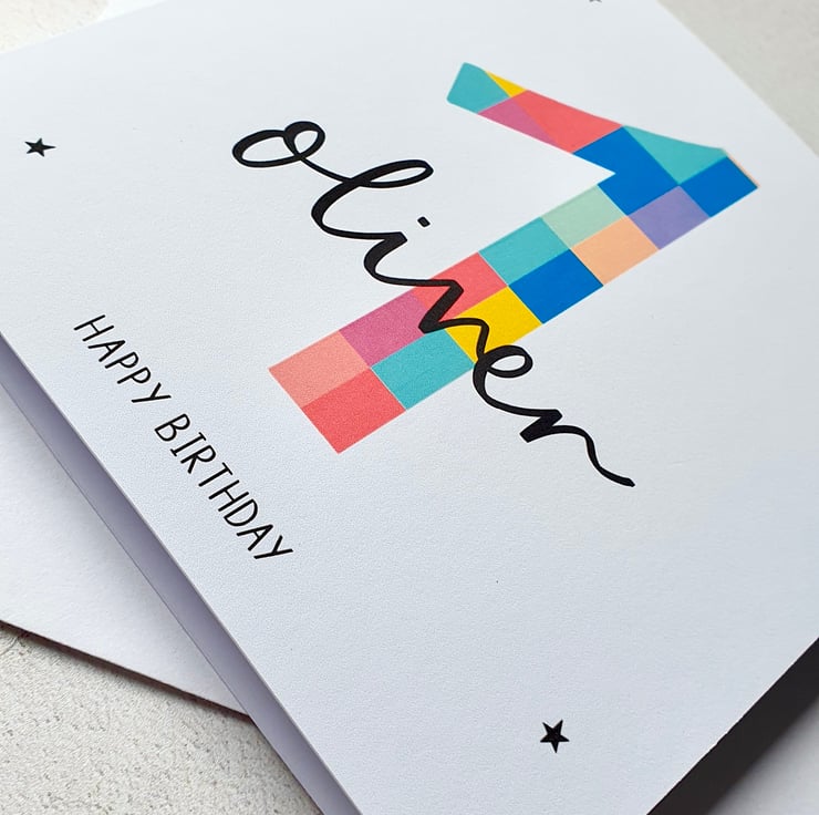- Personalised with name running across number, stars to decorate and text reading 'HAPPY BIRTHDAY'