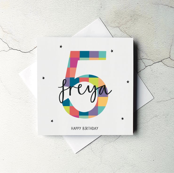 A bright and colourful birthday card for a bright and colourful 5 year old! This fun design is great for kids of any age and will be personalised with child's name and age to make it extra special!