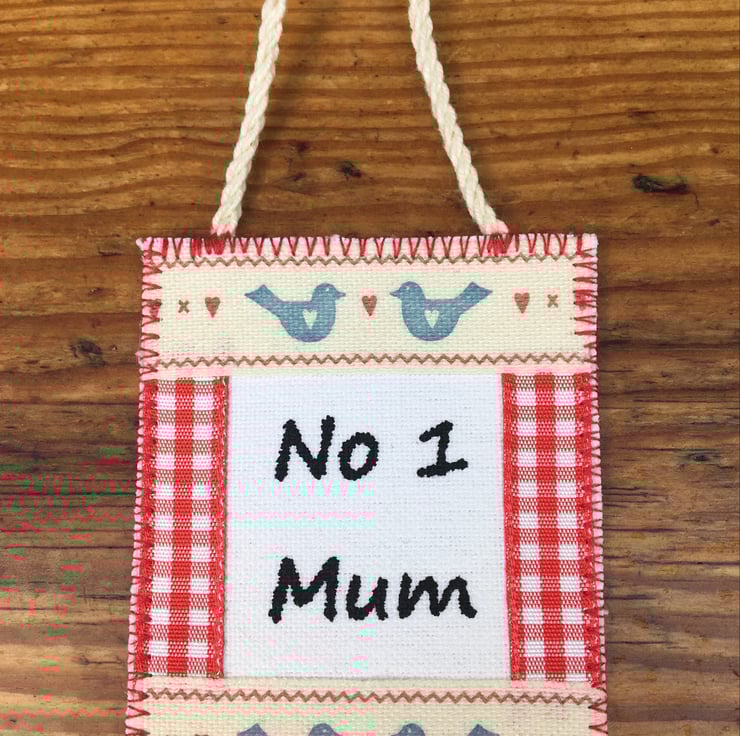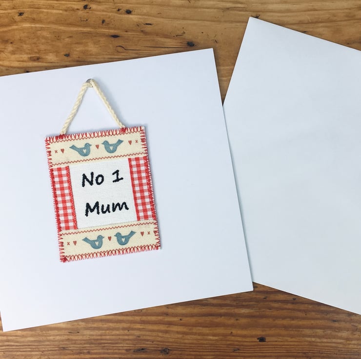 A charming personalised card for your Mum with the special message ‘No. 1 Mum’ beautifully crafted on a handmade fabric mini hanging. This fun hanging can be detached and kept as a decorative keepsake to cherish.
