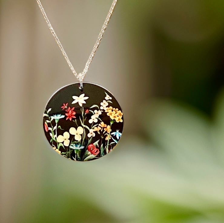 This is a disc pendant which I have handmade with a pretty wildflower design. Matching bracelet and earrings are available.