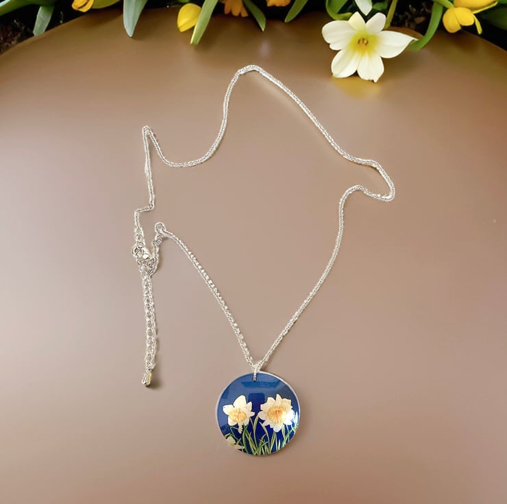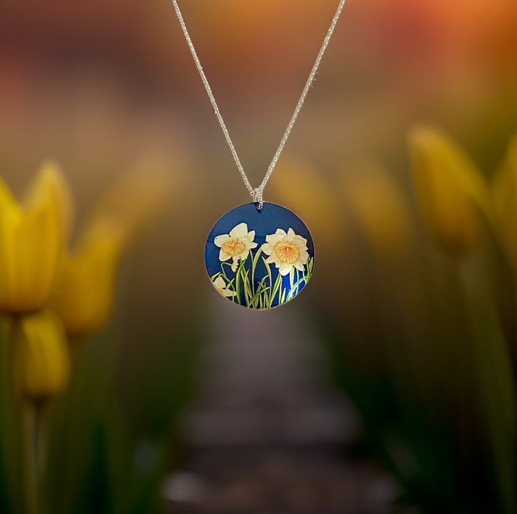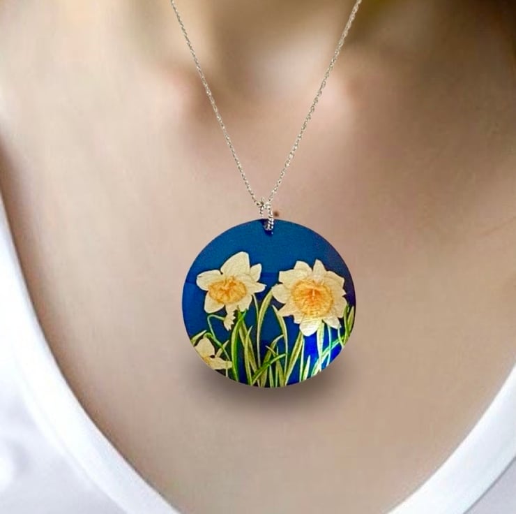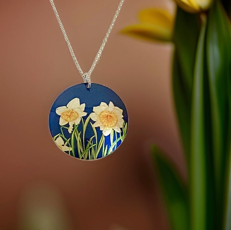 This is a disc pendant which I have handmade with a pretty daffodil design. Matching bracelet and earrings are available.
