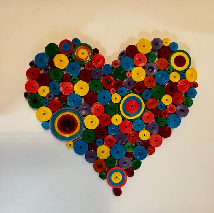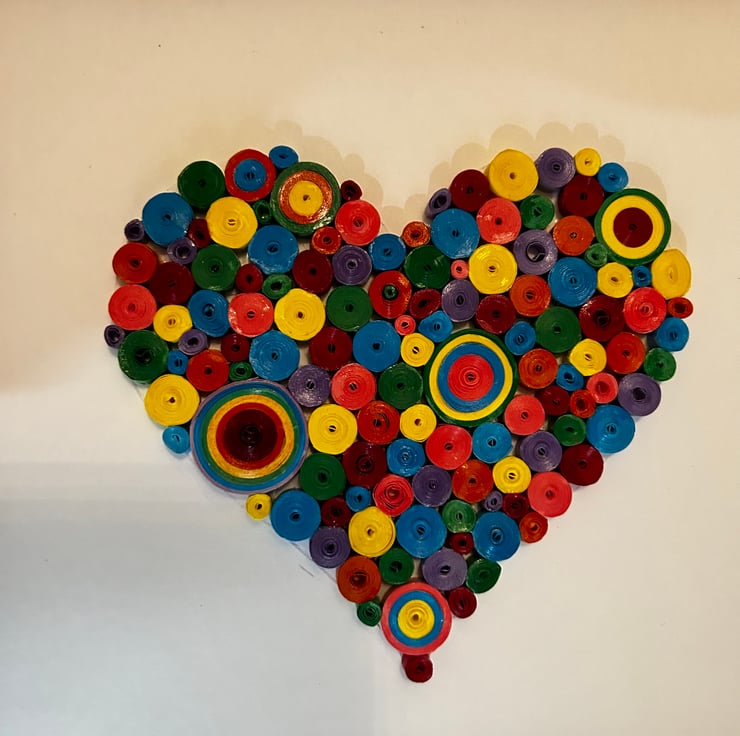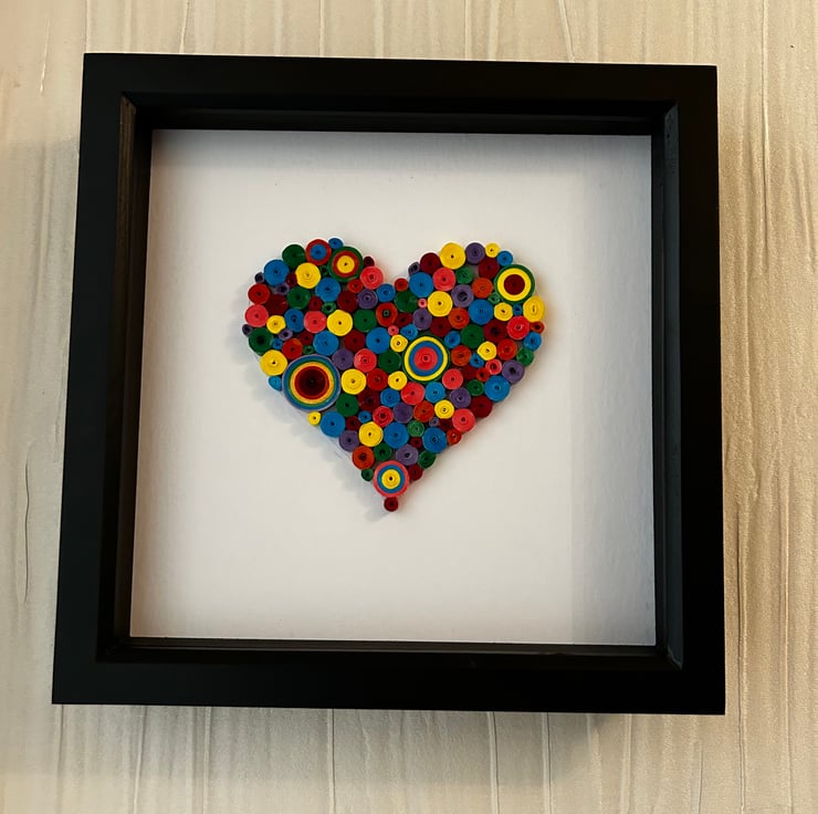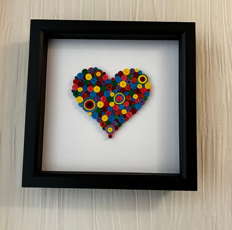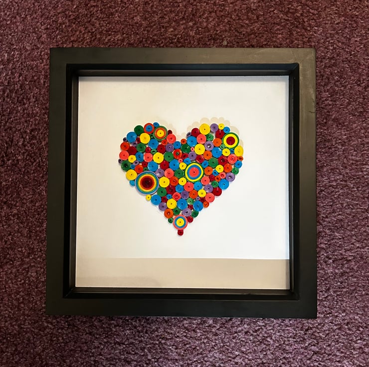 A beautiful colourful heart all made from quilled paper. This rainbow heart will make a lovely gift for someone special. I can also make it in different colours for you . Quilling is a form of papercraft using strips of paper and rolled up to make lots of different shapes. I really enjoy doing quilling as I find it a great help when coping with a chronic illness I can escape and enjoy creating a lovely craft. The size is 8x8 ins in a black frame though u can put it in a White one instead .