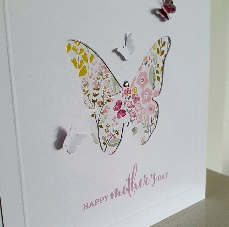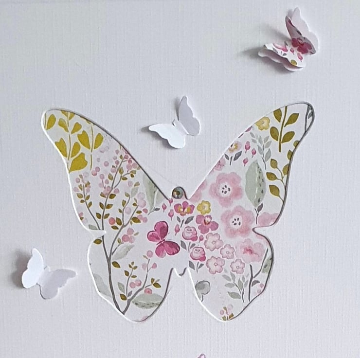 It features a cut out butterfly shape, cut out of linen card, lined with a pretty floral paper.