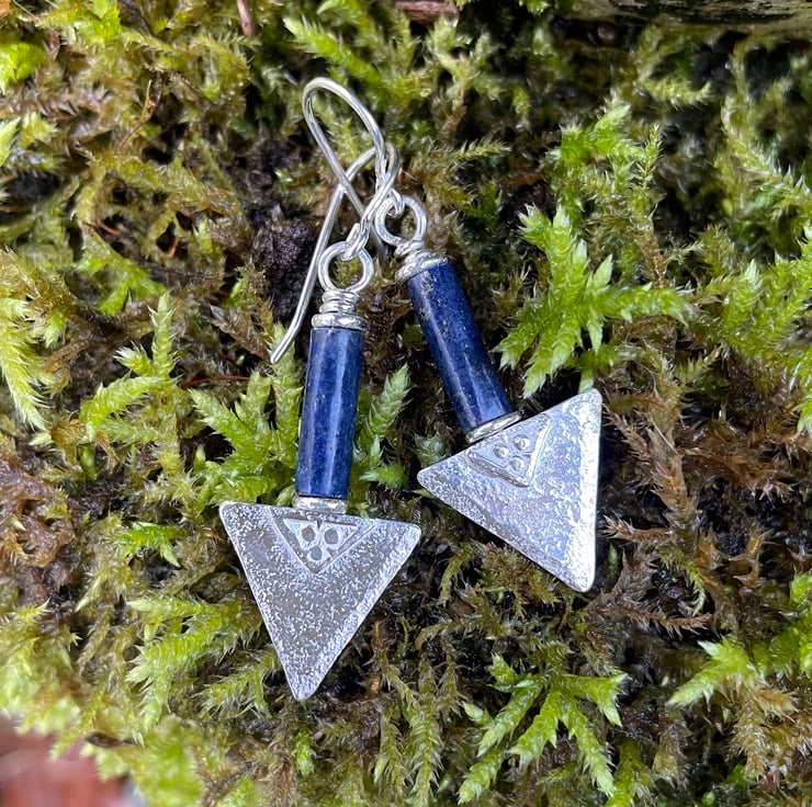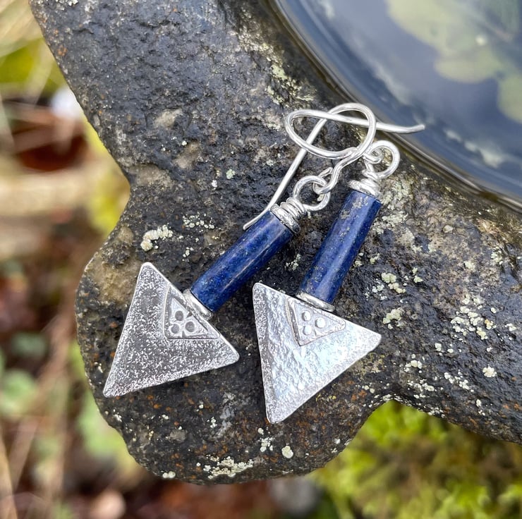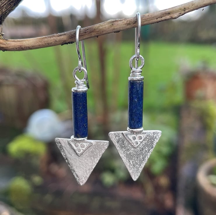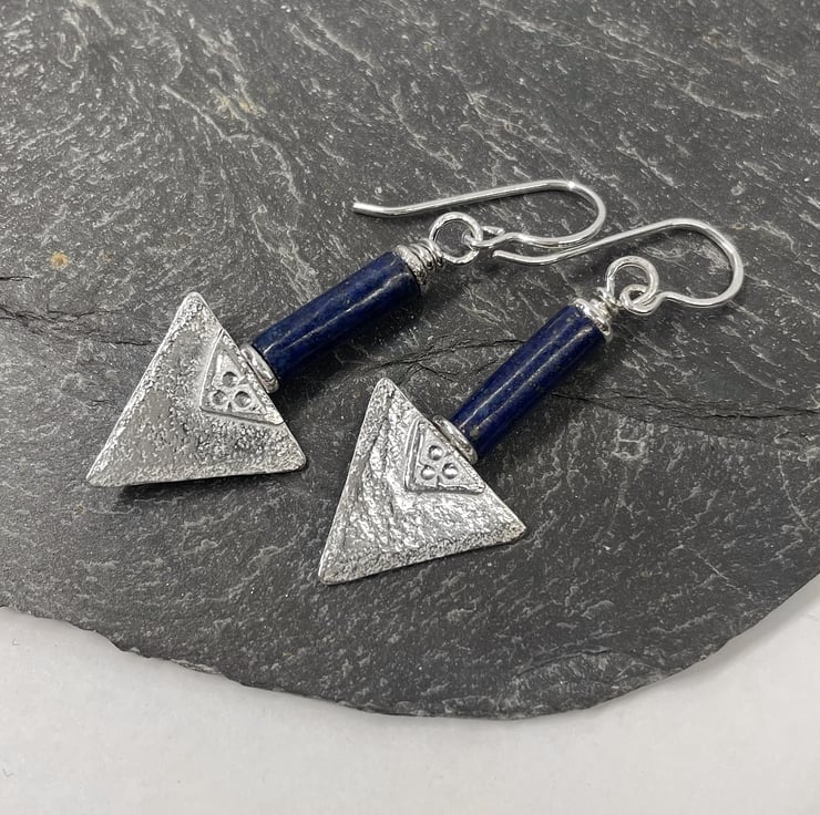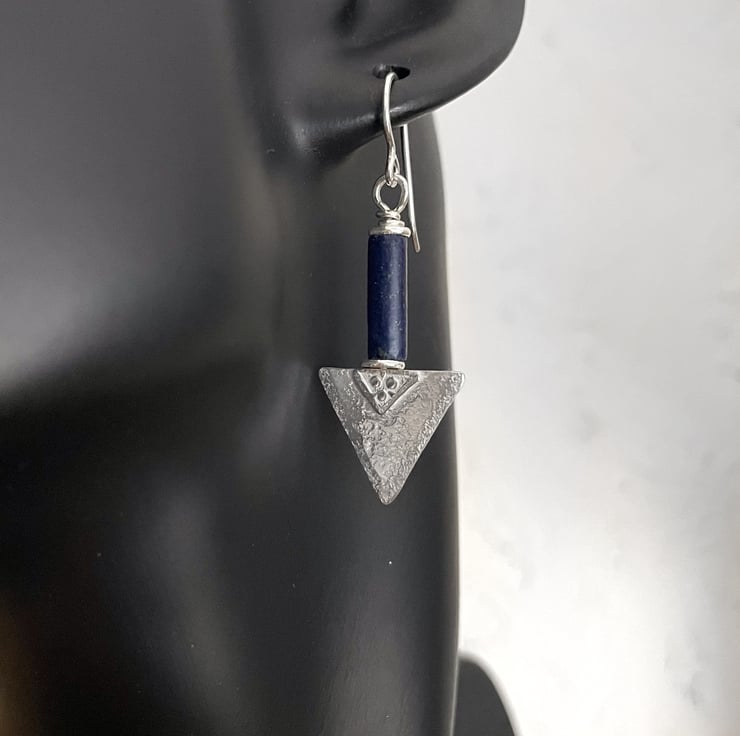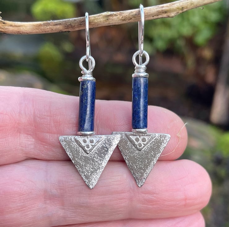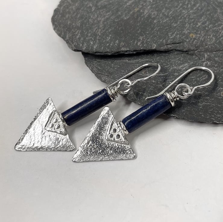 These earrings have a sterling silver triangle with a decorative trefoil type feature panel below a long dark blue lapis tube bead.