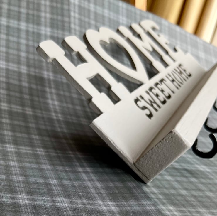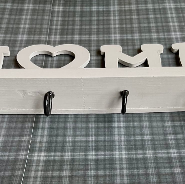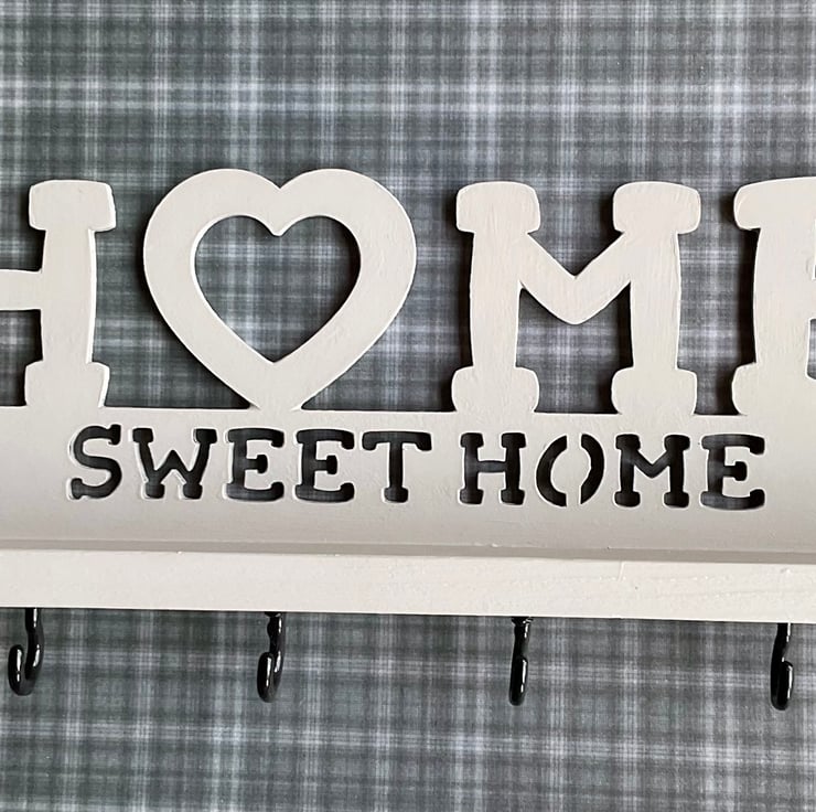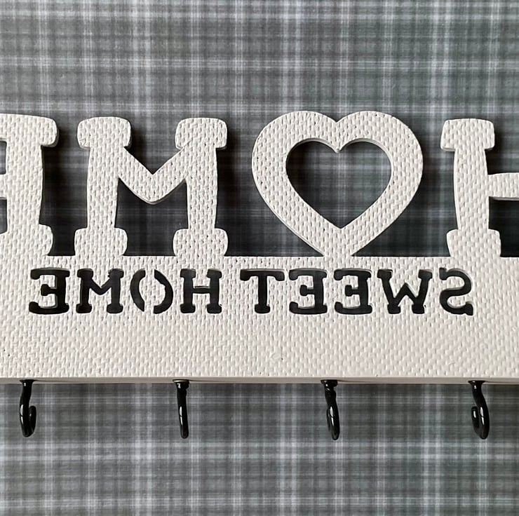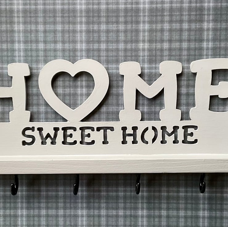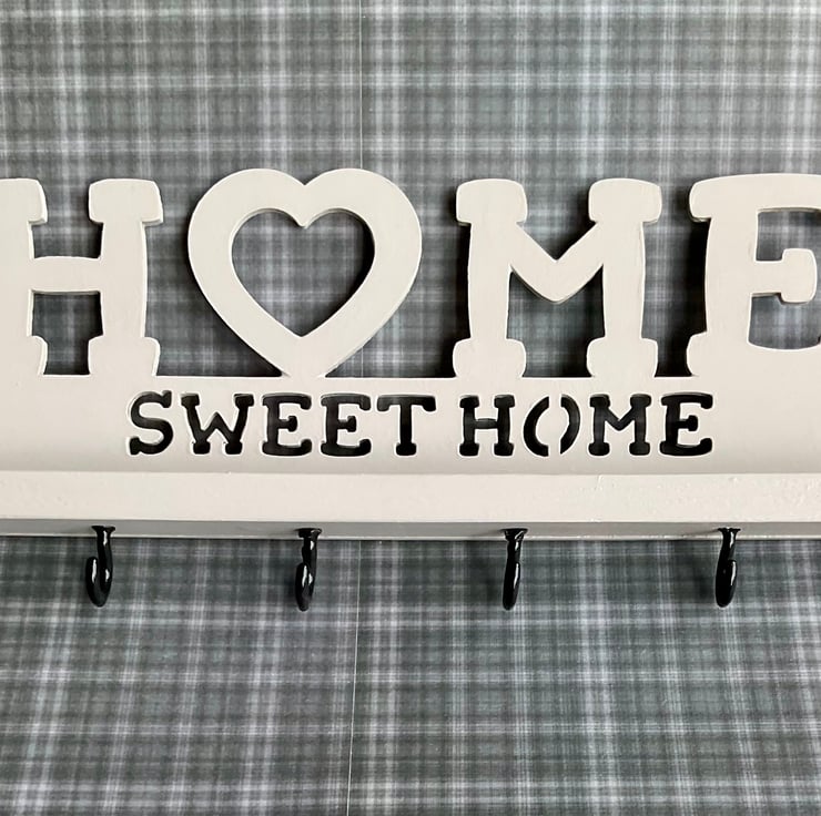 The hardboard has been laser cut with the words ‘Home Sweet Home’ and painted with a soft grey wood paint. Four black hooks have been added for your keys.