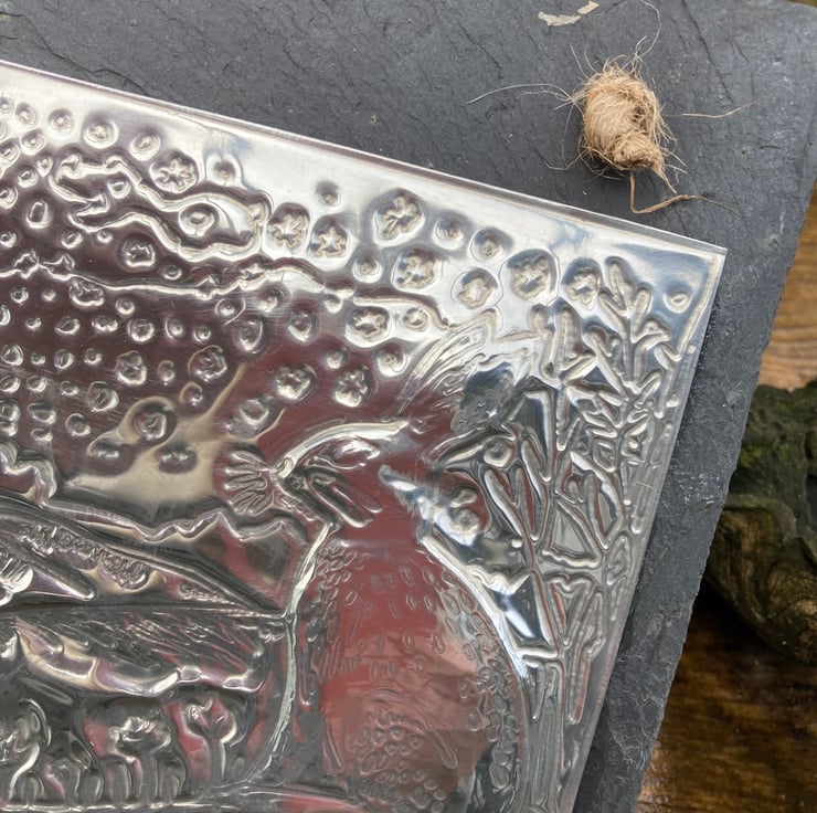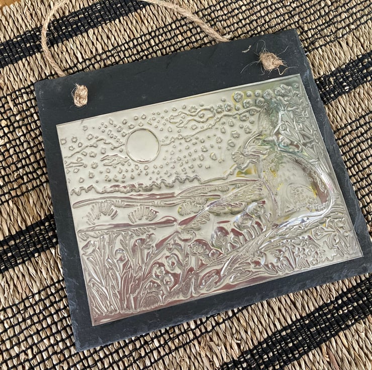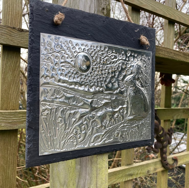 A lovely scene of the fabled hare gazing at the moon. This is created in pewter and mounted on reclaimed roof slate. It measures approximately 19cm x 18cm and is ready to hang on rustic twine supplied. This is weatherproof so it can hang in the garden quite happily. Pewter doesn’t tarnish, it just attains an attractive patina over time, although you can polish it if you prefer the original shine.