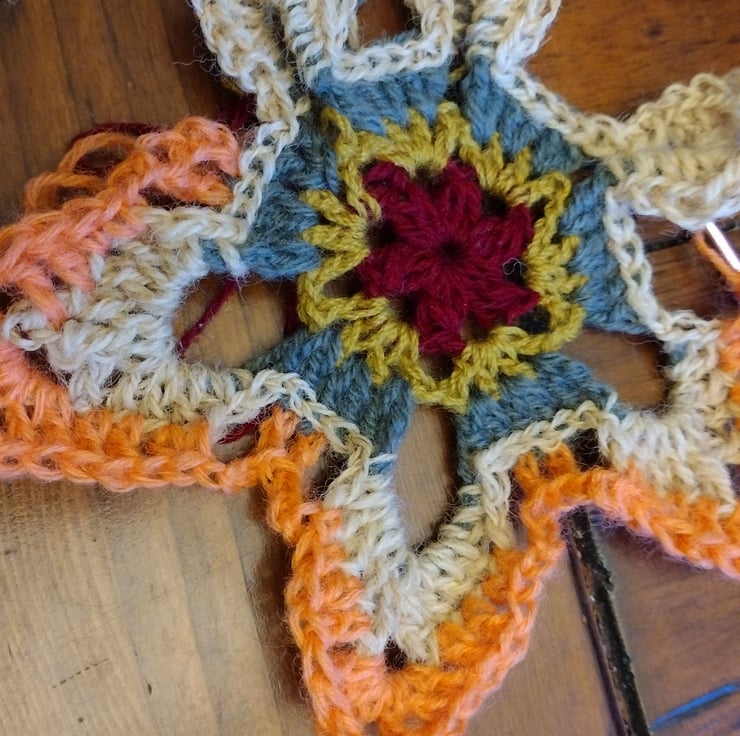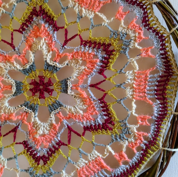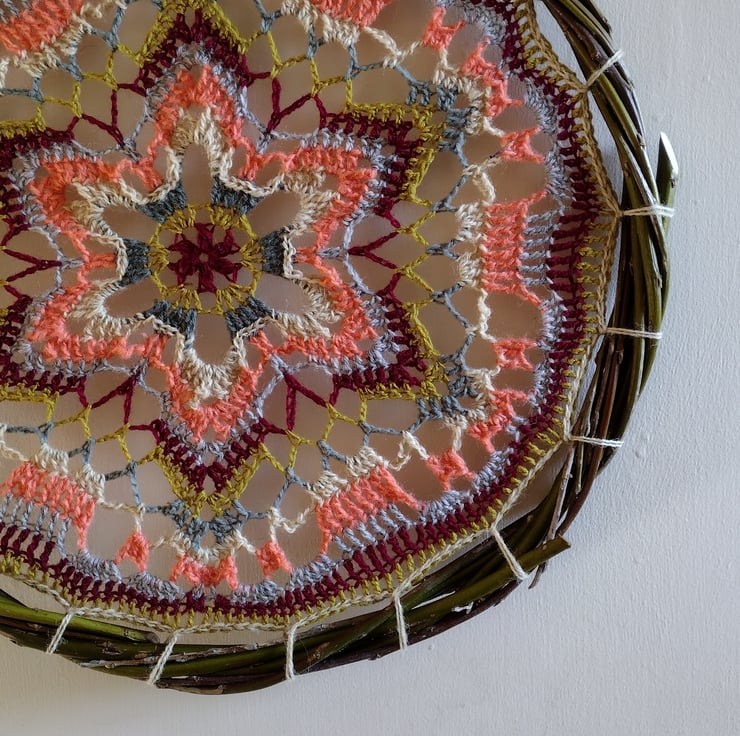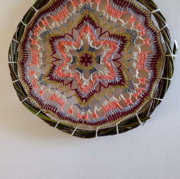 Crocheted mandala handmade using six different coloured preloved yarns. This beautiful starflower design is mounted onto a natural hoop made from willow twisted together. The willow has been sustainably sourced from my wildlife friendly garden right here in the Fens.