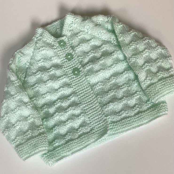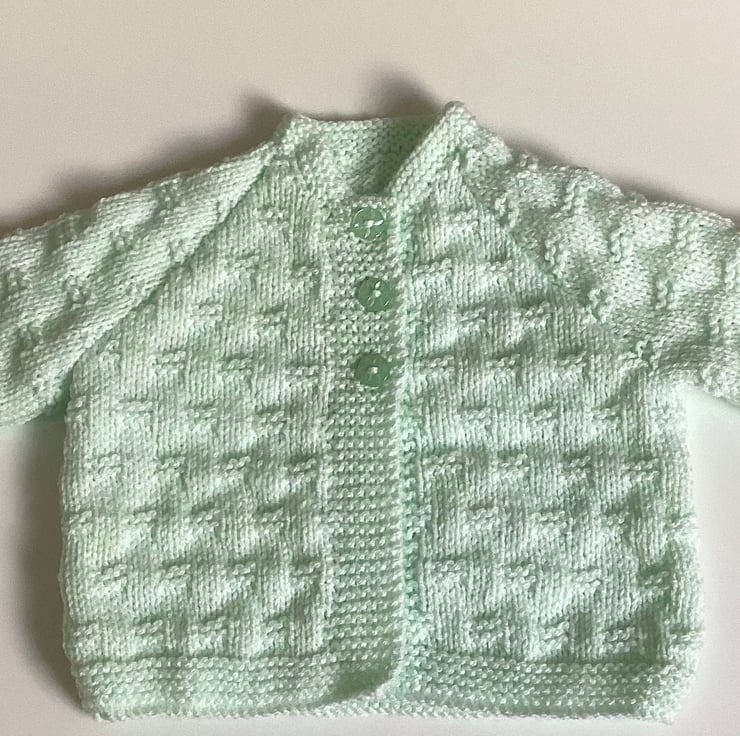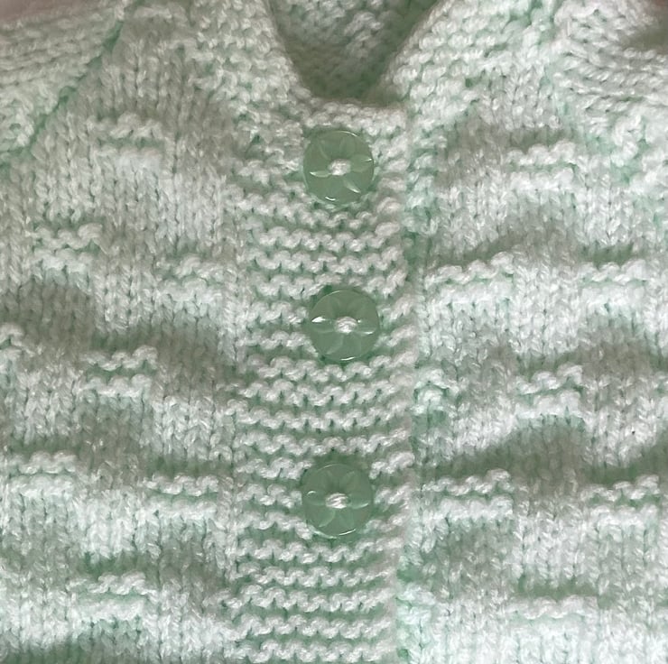 Beautiful baby cardigan hand knitted by me in my Suffolk home. I love this gorgeous mint colour for a new spring or summer baby. I have used a good quality easy care baby yarn to knit this little cardigan using one of my most popular vintage style patterns that is perfect for a baby from birth to three months approximately.