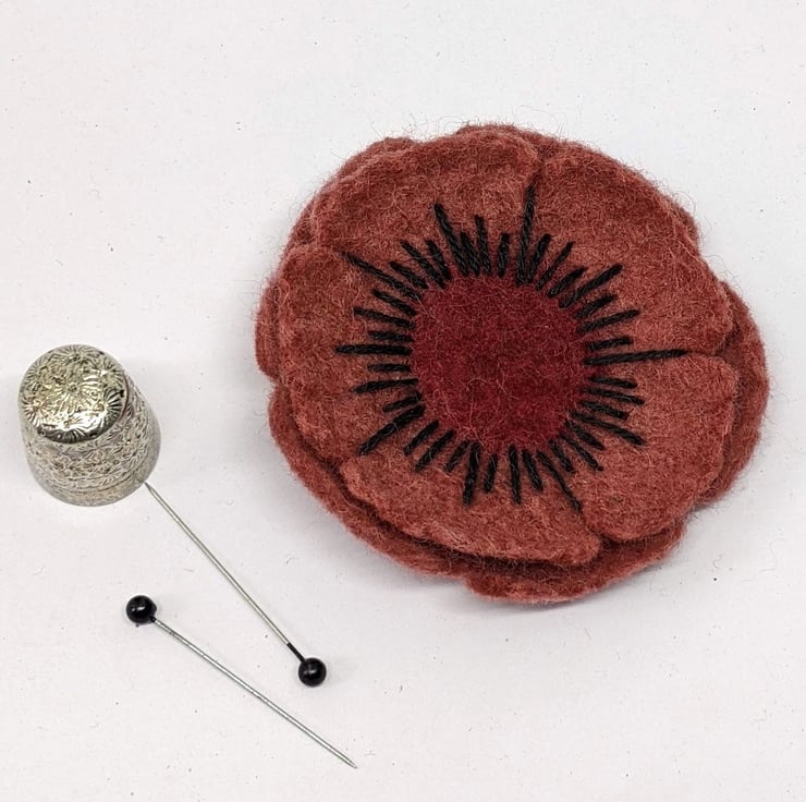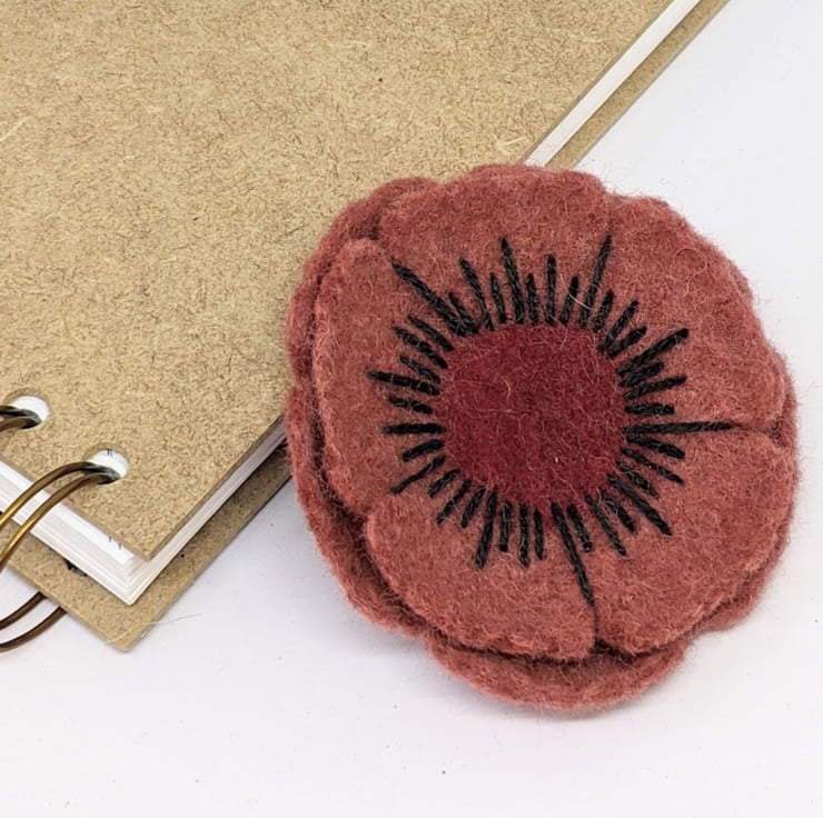 This unusual terracotta coloured flower is double layered with a contrasting dark red centre, embellished with bold black handstitching.