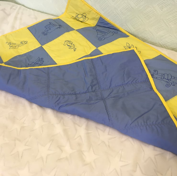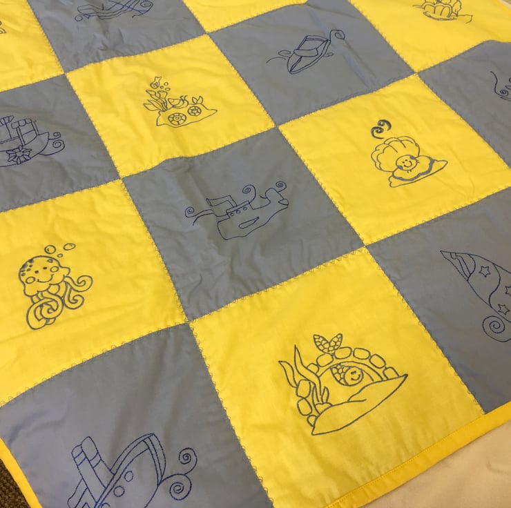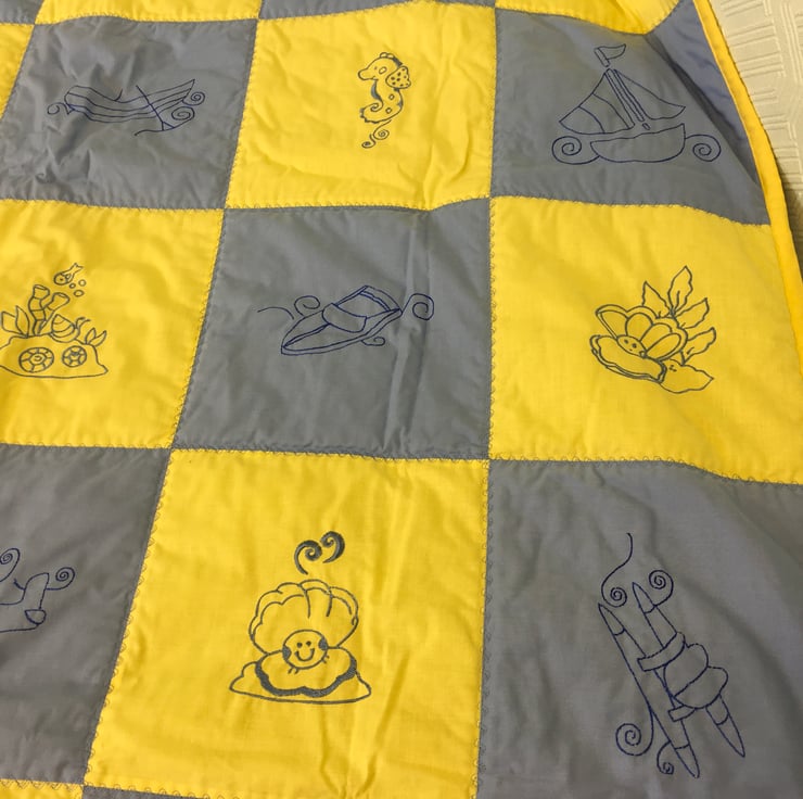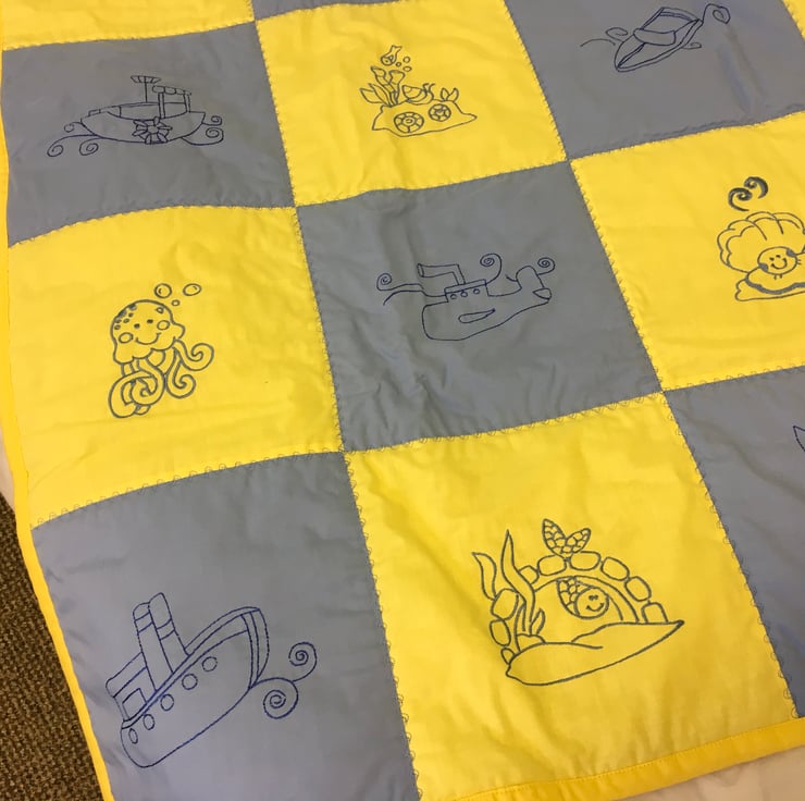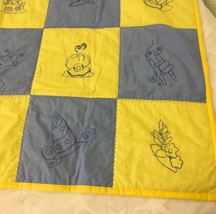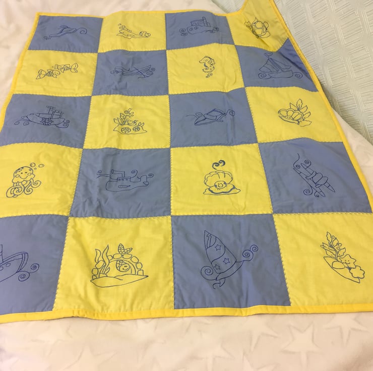 This bright and cheerful quilt in yellow and blue quilting cotton squares, has funny sea-life designs such as fish, boats and shells embroidered on it. I then layered and quilted it and bound the edges in yellow to finish. Suitable for a cot, travel cot or play mat etc. this quilt measures 36” wide x 44” long. ( 91 x 113 cms ) and is machine washable at thirty degrees.