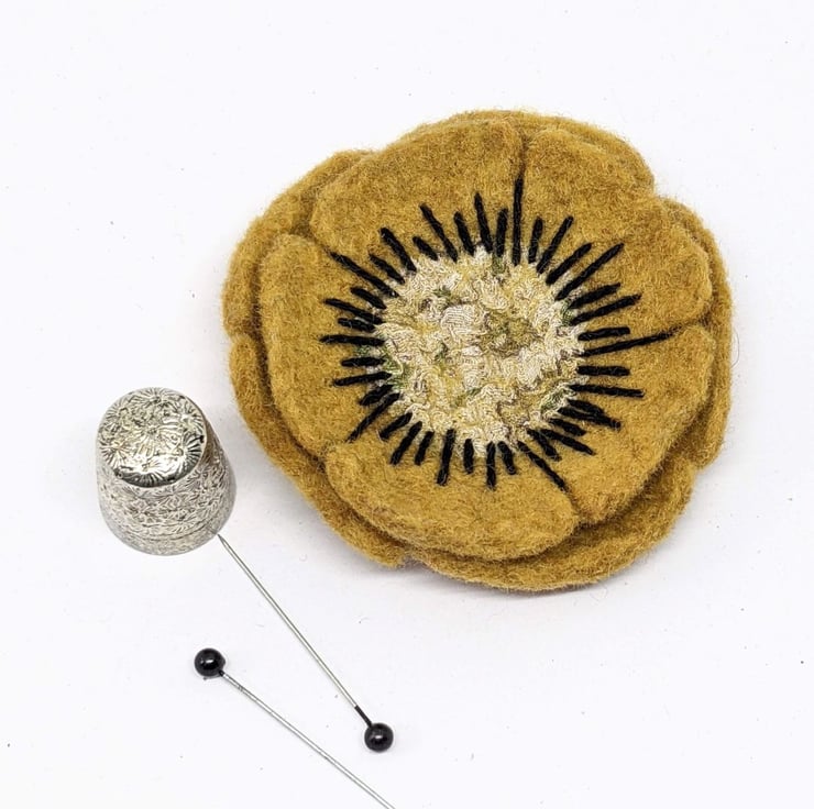 The mustard yellow flower is double layered with a contrasting recycled sari silk centre, embellished with bold black handstitching.