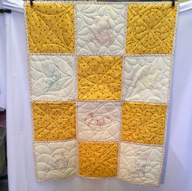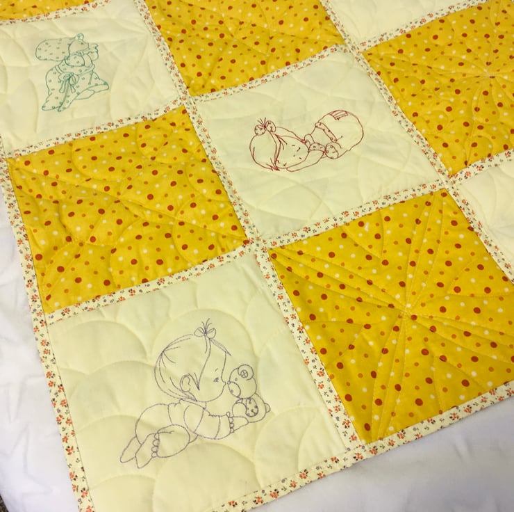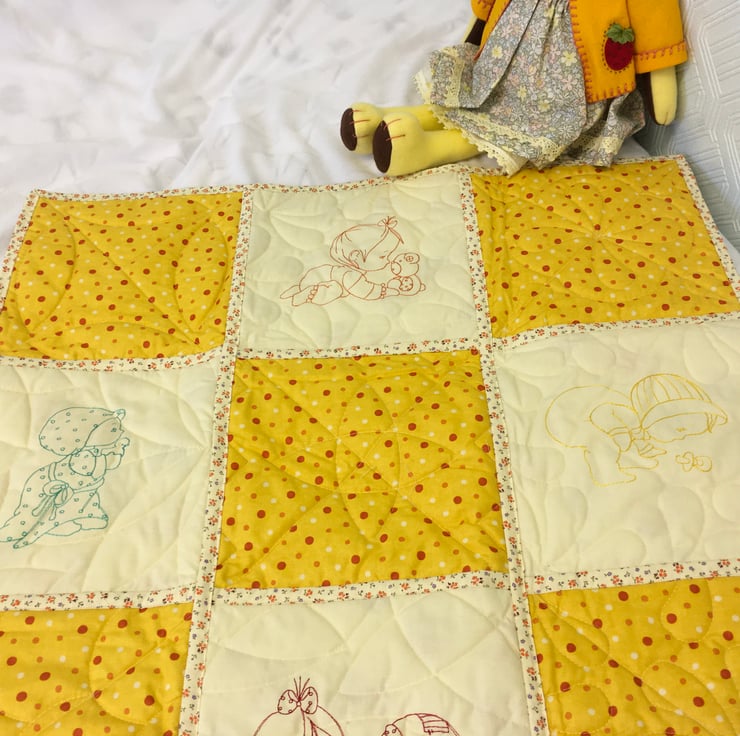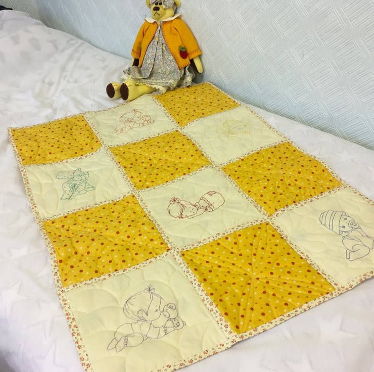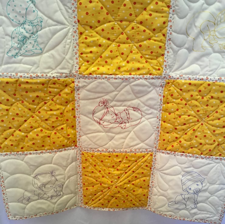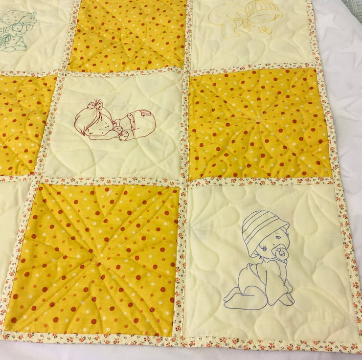This brightly coloured quilt will cheer up any toddlers bedroom with machine-embroidered motifs of cute baby girls in different colours of thread.
