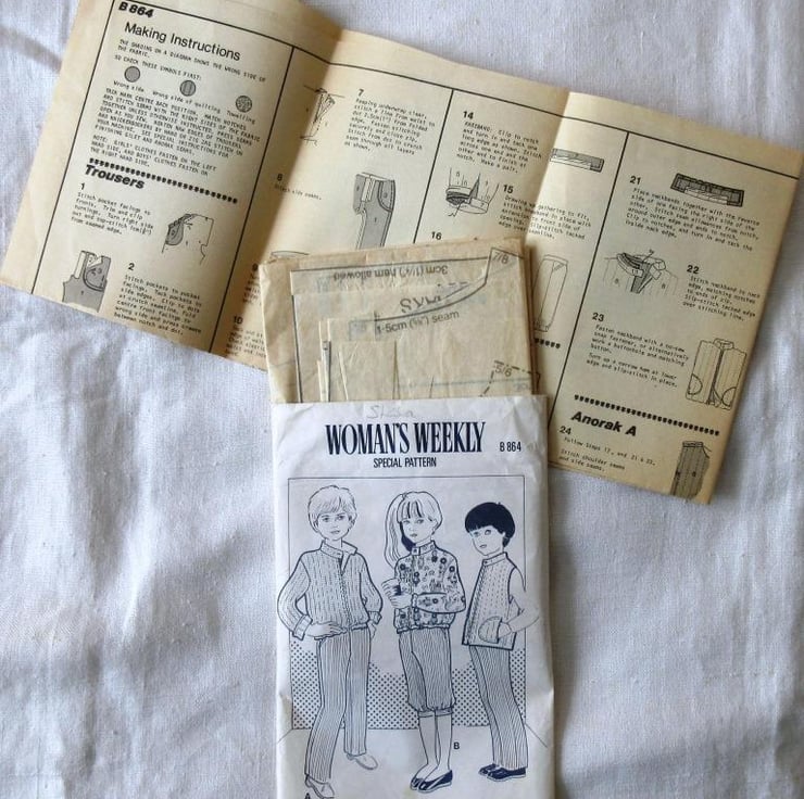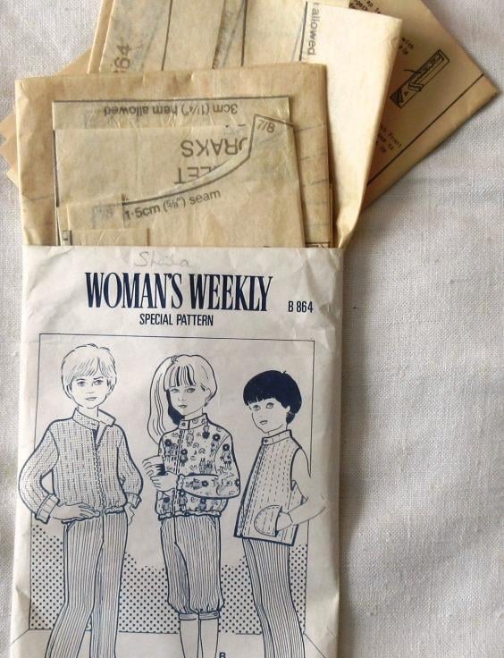 A multi-size sewing pattern for a child's trousers, knickerbockers, gilet and anorak in three sizes: 3/4 - 22-23"/56-58 cm; 5/6 - 24-25"/61/64 cm; 7/8 - 26-27"/66-69 cm (Woman's Weekly Special Pattern B864). The anorak and sleeveless gilet have zip fastenings. The gilet has a pocket. The pattern has been used to make the sleeveless gilet in the biggest size, consequently every size is still usable. The pattern is not dated, but I estimate that it probably dates from the 1970s.