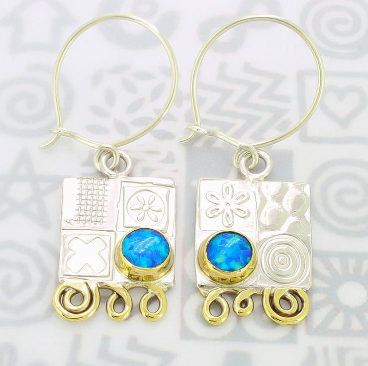 These uniquely designed earrings have been handmade by us in our workshop in Yorkshire. They are made from sterling silver and feature embossed shapes and textures, decorative brass hoops and two beautiful 6mm Indian Amethyst gemstones set in brass bezels, (other stones are available). They are similar to earrings in our Asymmetrical range of jewellery but feature a stone and decorative brass hoops on each earring. They measure 15mm x 15mm and the ear wires are made from sterling silver.