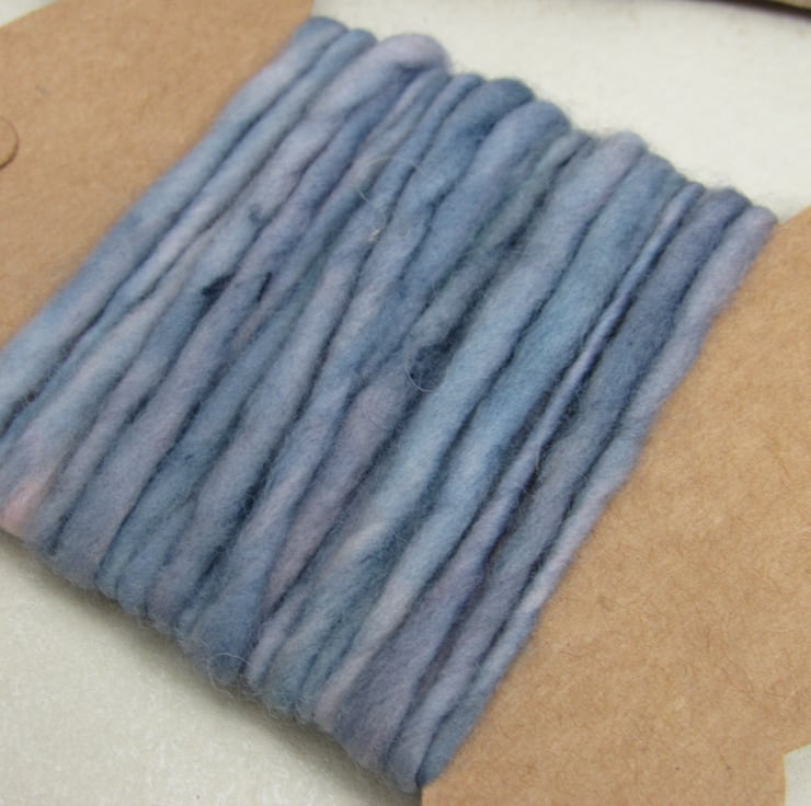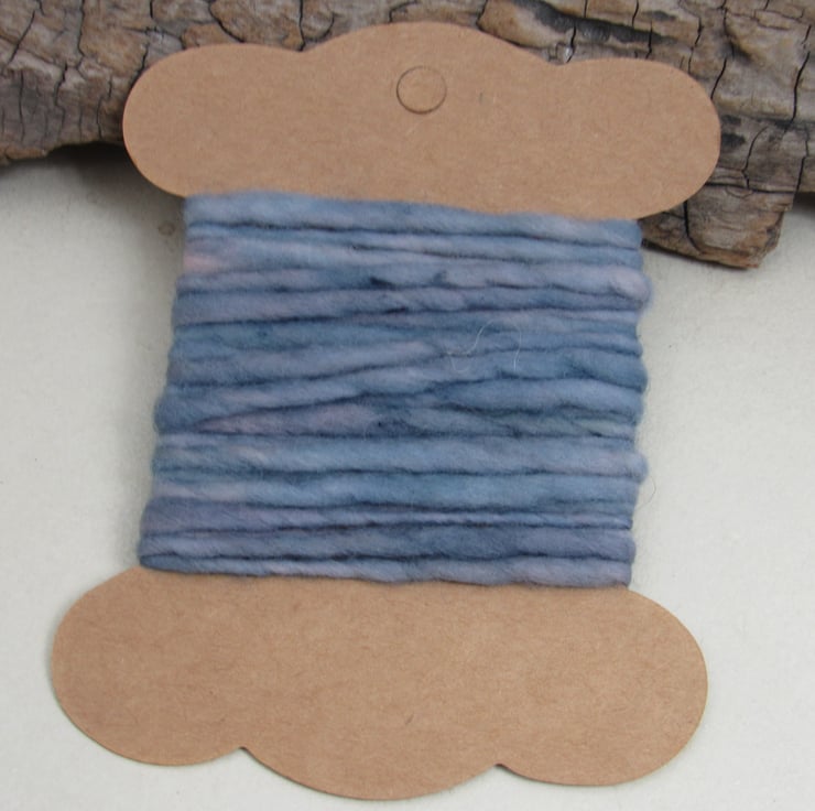 Hand dyed slubby single handspun Corriedale yarn, dyed with natural cochineal and indigo dyes to give a soft lilac purple