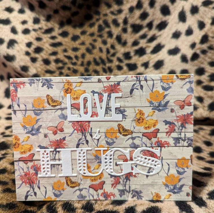 Pretty A6 landscape yellow card stock overlaid with wood effect panels covered in flowers and butterflies