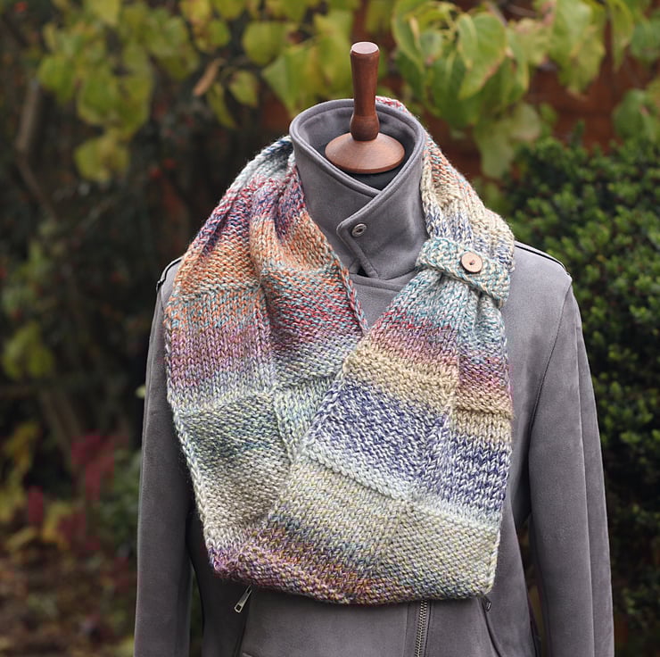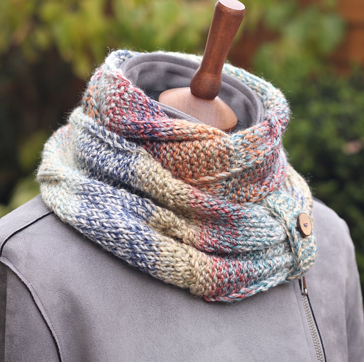 SCARF, knitted infinity loop scarf, chunky blue, cream, orange womens snood