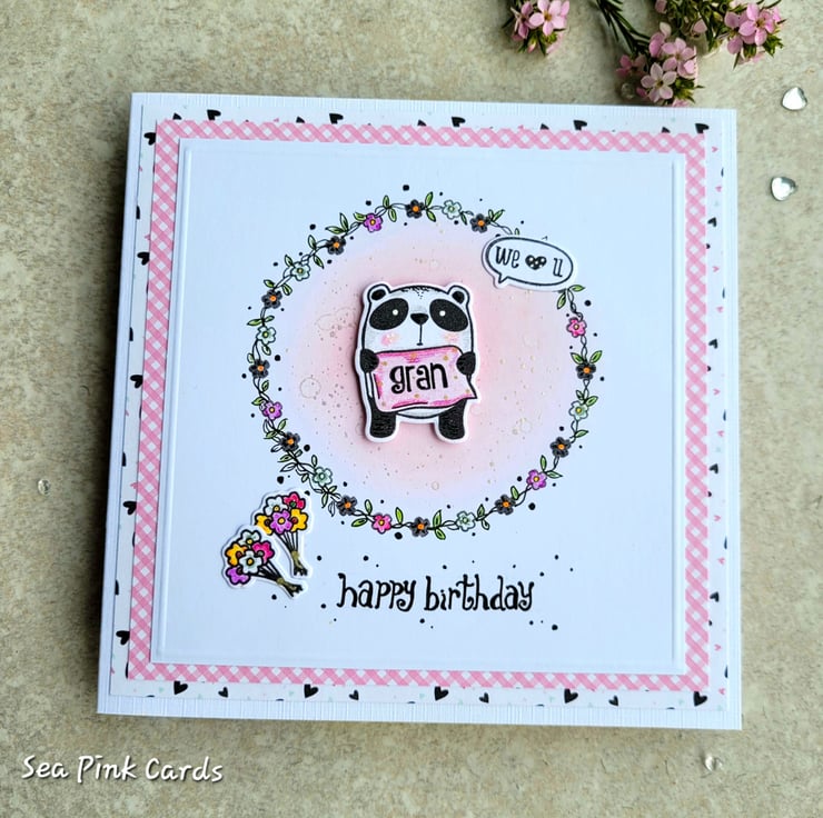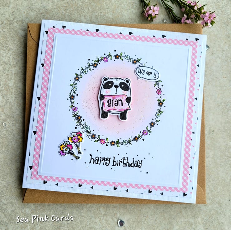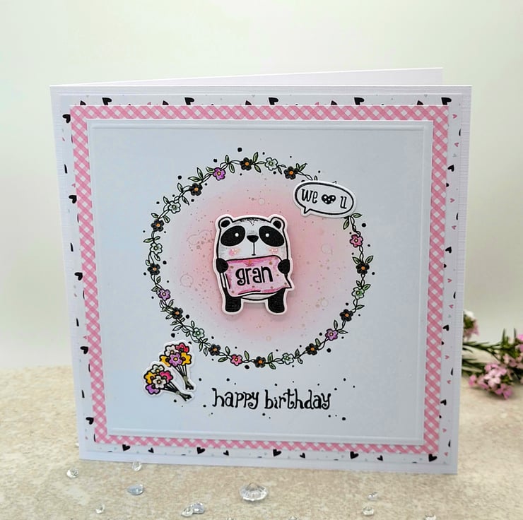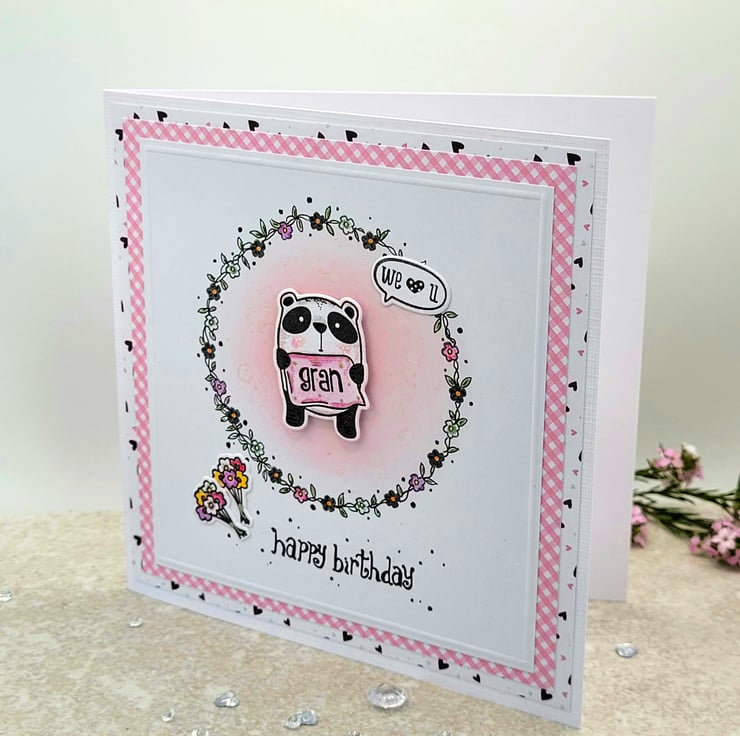 A cute little panda inside a floral wreath, with a special birthday message for a lovely Gran! We love you Gran, that is the sentiment behind this special handmade card. Designed and stamped by hand in my craftroom, this individually handmade card has a hand-drawn wreath, with stamped flowers and an adorable little panda holding a sign. Blank inside for your own message.
