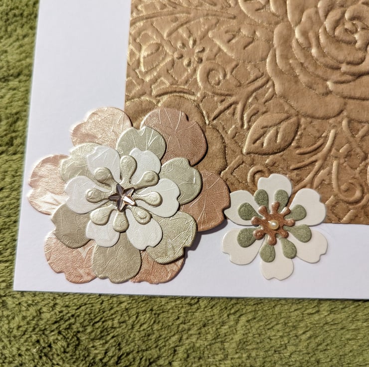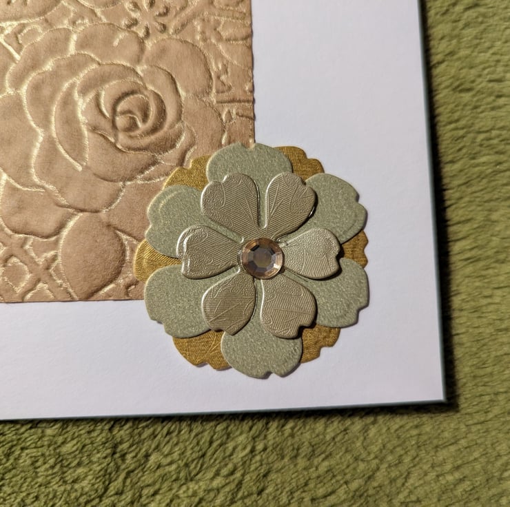 A5 landscape white card stock with a central rectangle of beautiful dark gold lined with bright gold, corners all flanked with beautiful gold flowers
