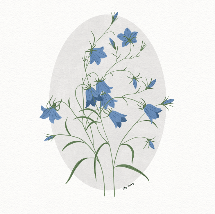 This stunning botanical flower illustration captures the beauty of dainty Bluebell flowers with intricate detail.