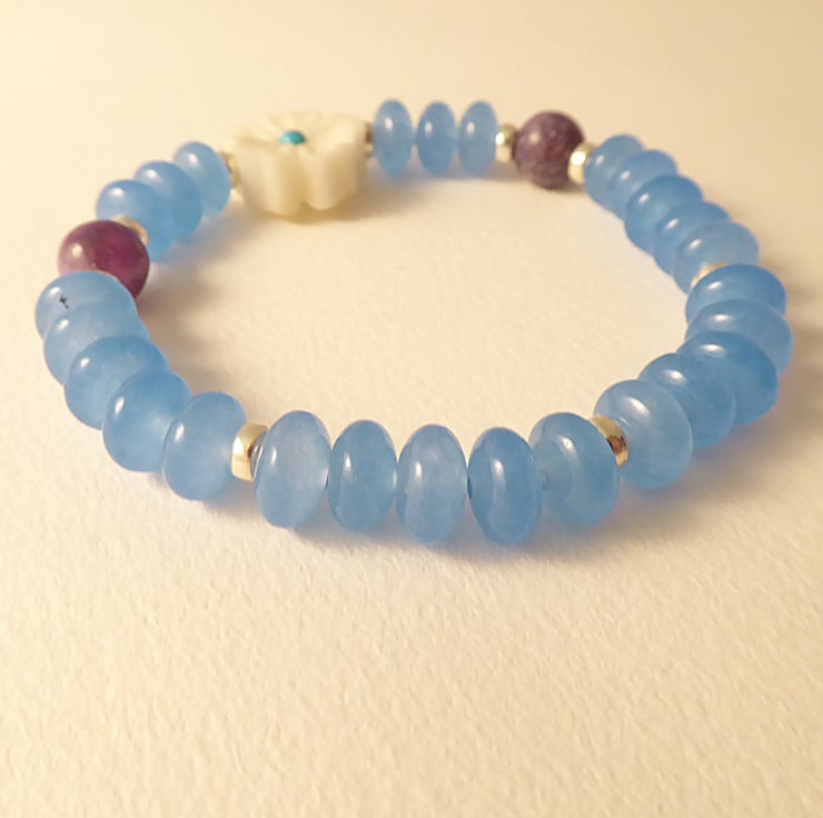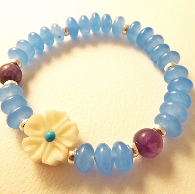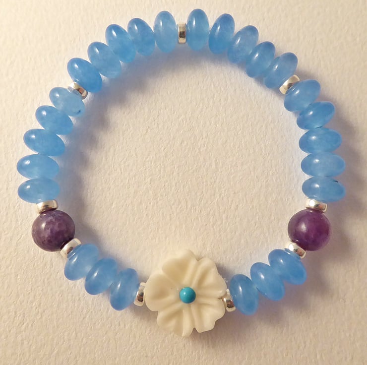 This bracelet is made from some nicely coloured Brazilian aquamarine rondelle 8 mm beads with two 8 mm purple lepidolite beads set off with sterling silver. The focus of the bracelet is a hand carved tagua nut in the shape of a flower with a turquoise blue centre.