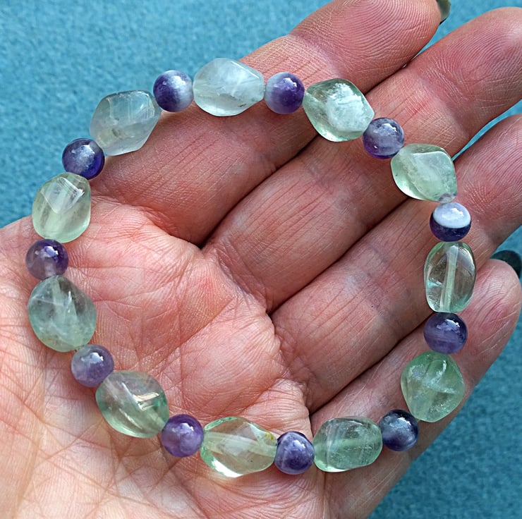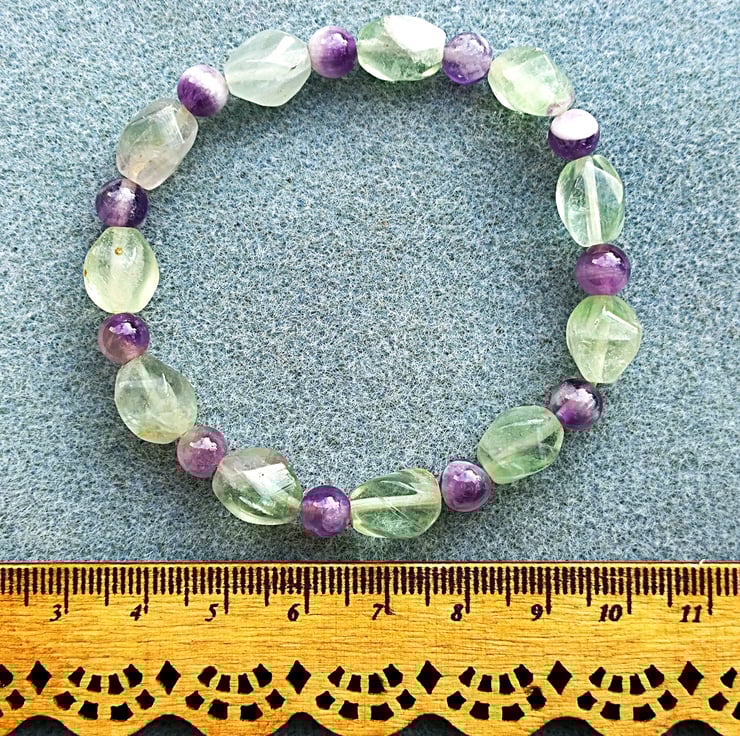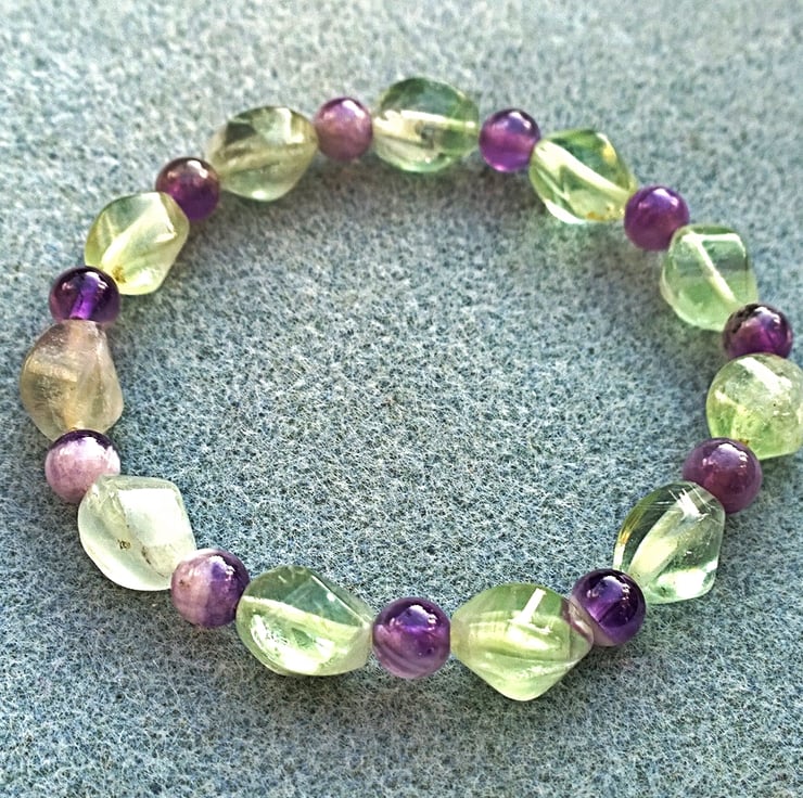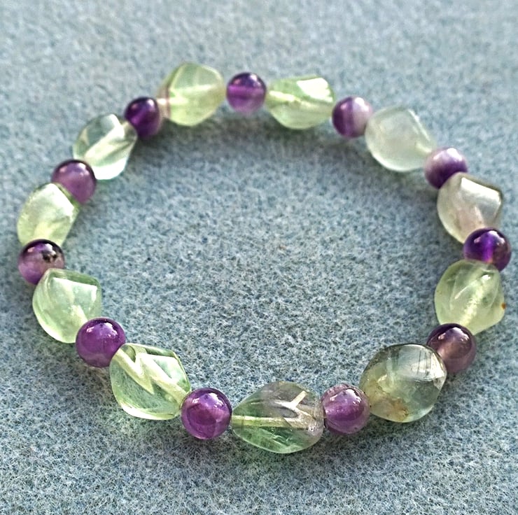 This bracelet is made from green fluorite twist nugget beads that have the occasional tinge of purple in them which sets the purple of the amethyst off very nicely. This is chevron amethyst or amethyst sage agate, a member of the quartz family where beautiful purple amethyst meets feathery white areas of chalcedony.