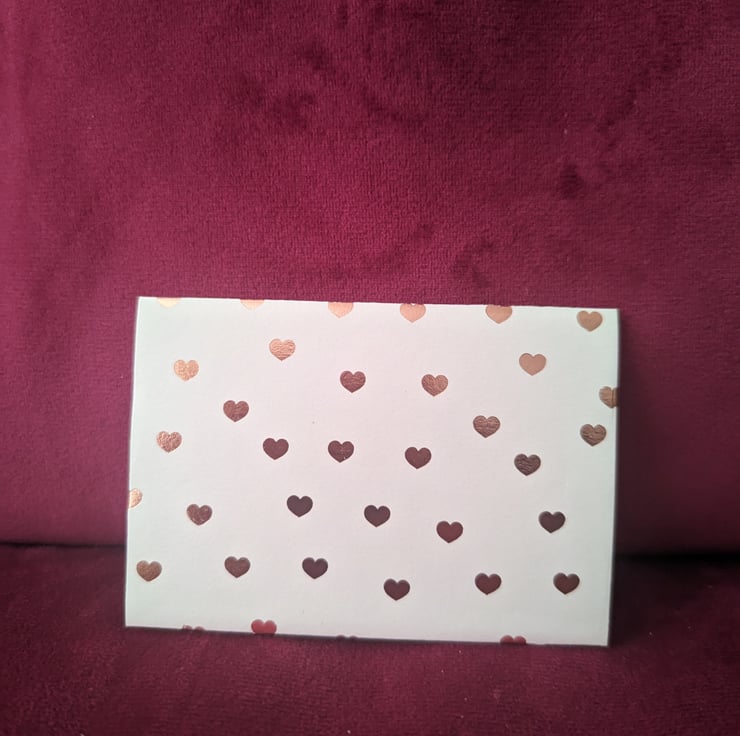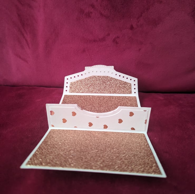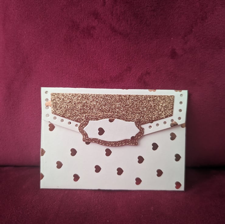 3 3/4 x 2 1/2 inch gift card holder in white card stock with rose gold hearts with accents inside and out of rose gold sparkly card stock