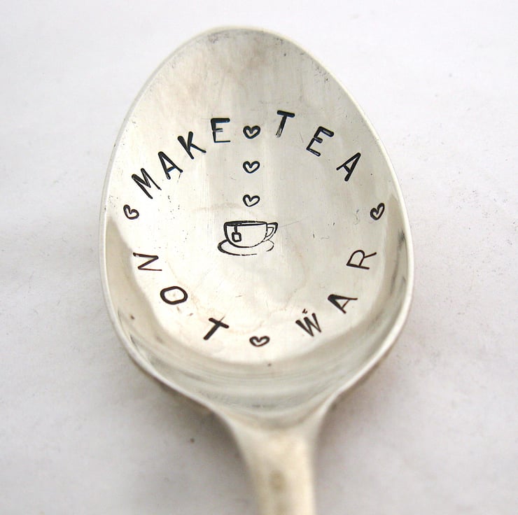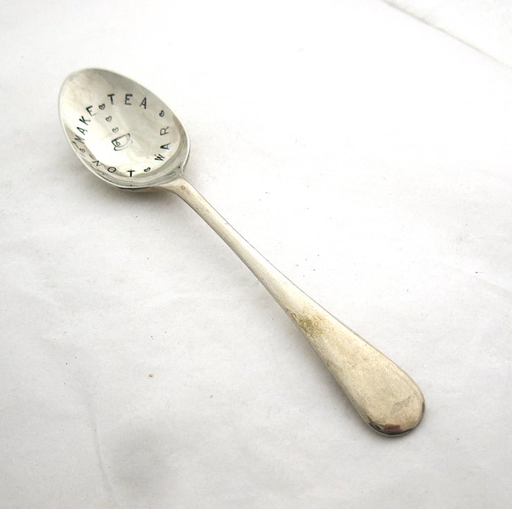 A hand stamped vintage nickel silver alloy tea spoon with the words MAKE TEA NOT WAR in a circle around a little teacup icon. The words are separated by tiny hearts and there are more tiny hearts rising from the cup, like steam...