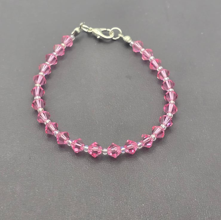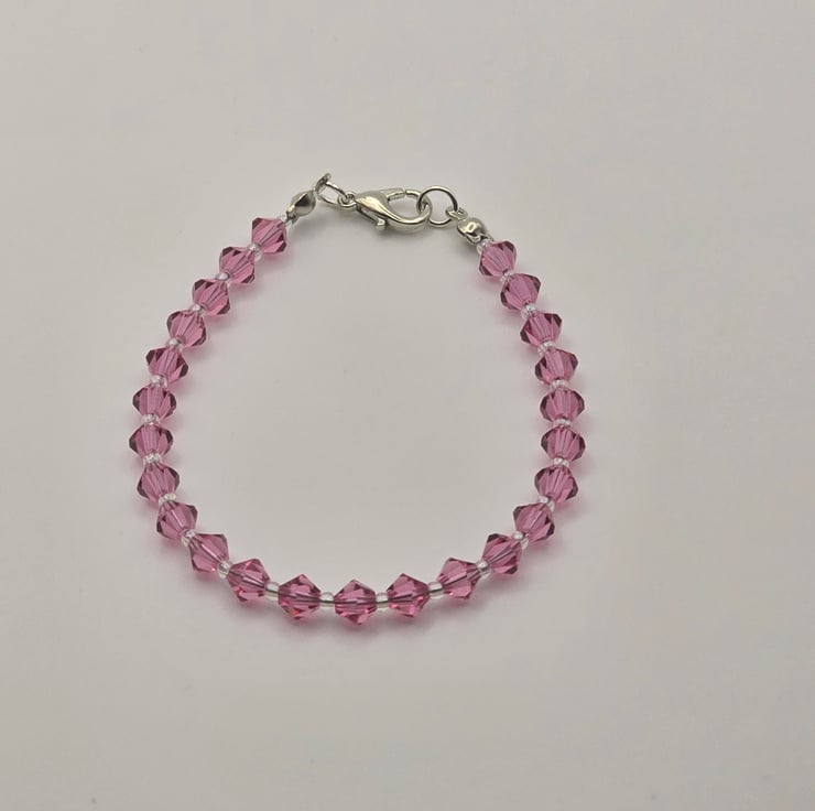The bracelet was made using 5mm Preciosa Crystal Bicones in the colour Rose. The Preciosa Crystal Bicones are all the way around the bracelet and have small crystal AB seed beads in between. The beads are on a thin beading wire and fasten with a silver clasp.