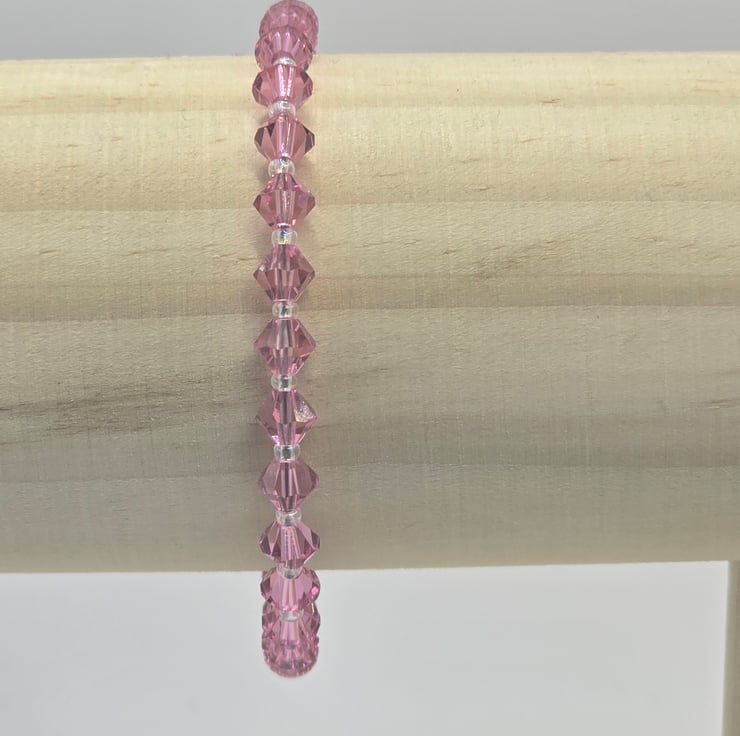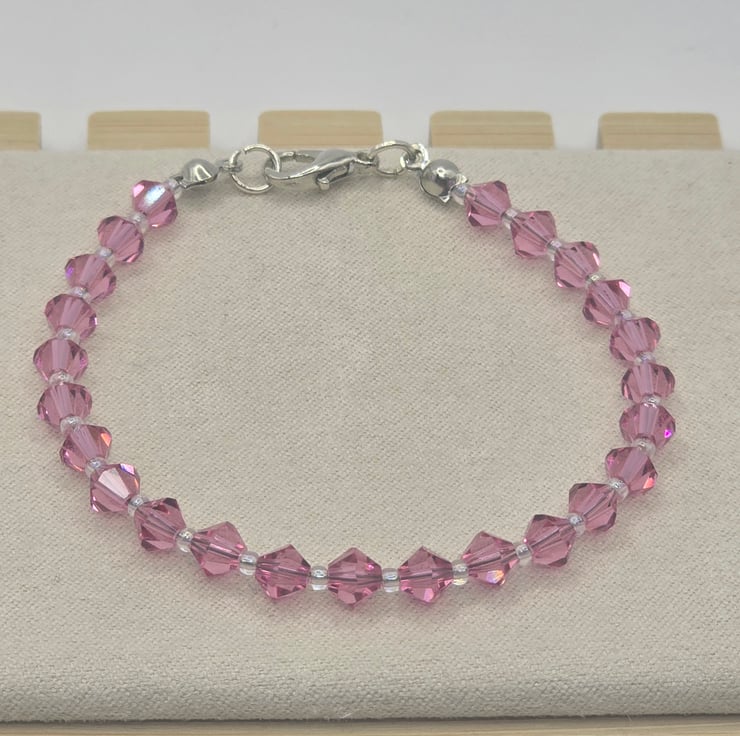 The bracelet was made using 5mm Preciosa Crystal Bicones in the colour Rose. The Preciosa Crystal Bicones are all the way around the bracelet and have small crystal AB seed beads in between. The beads are on a thin beading wire and fasten with a silver clasp.