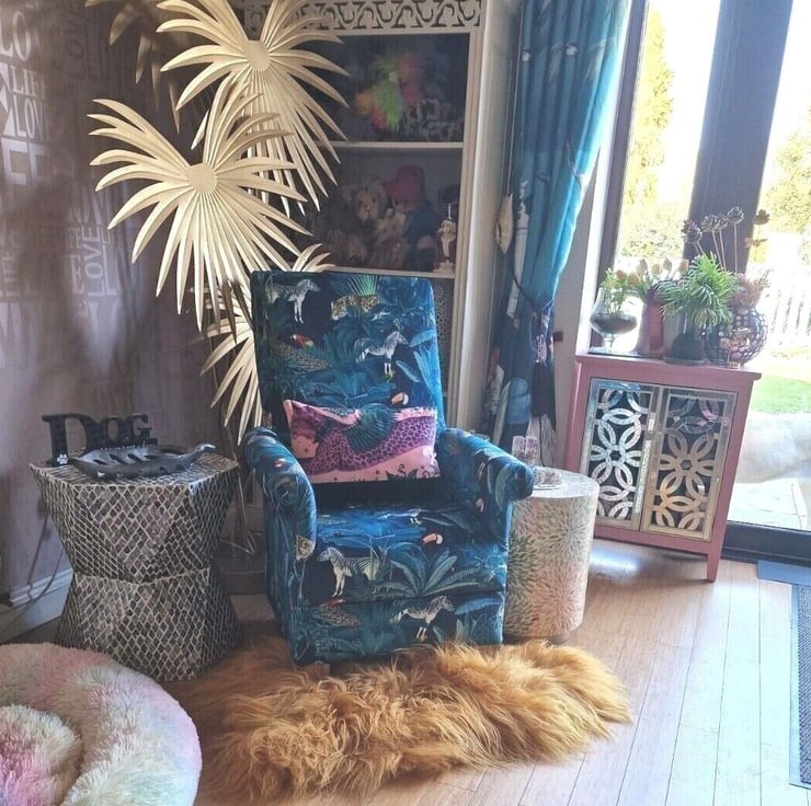 This lovely adult's armchair measures approximately 38 inches in height, by 26 inches wide and will look gorgeous in any room and is a real accent piece of furniture. It has a wooden frame and has a Schedule 3 fire retardant interliner, which makes it compliant with UK fire regulations. It is then upholstered entirely with this gorgeous fabric, and has solid wooden feet.