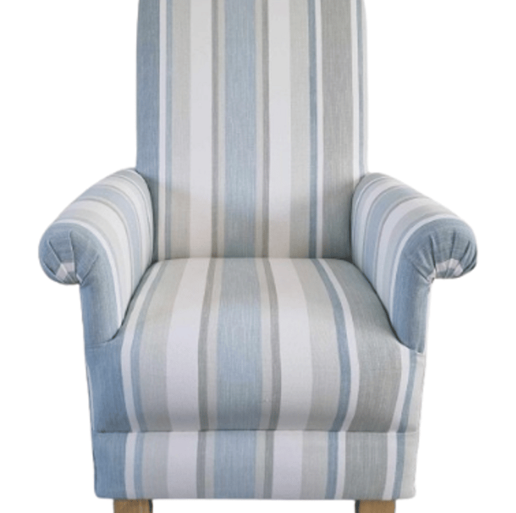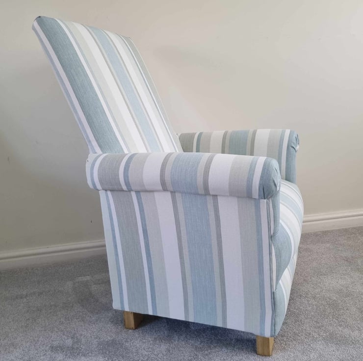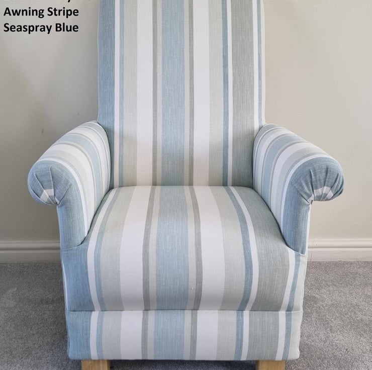 This is a handcrafted, sturdy adult sized armchair, which has been made by myself, a professional upholsterer with over 32 years experience, using Laura Ashley Awning Stripe Blue fabric.