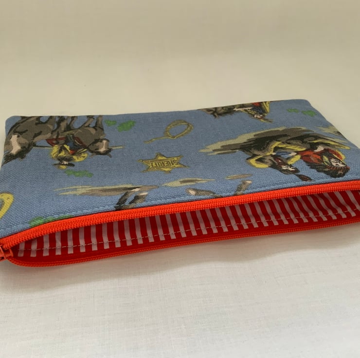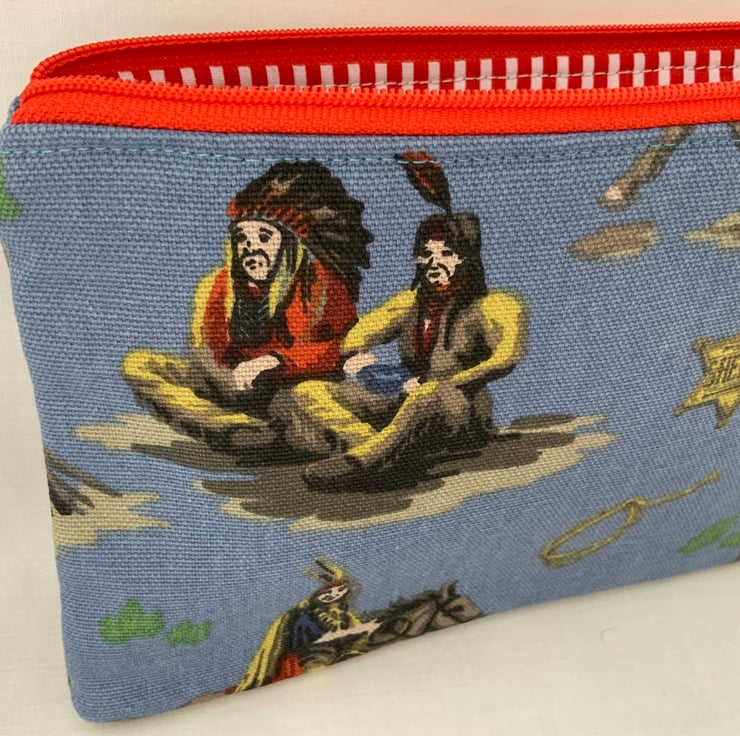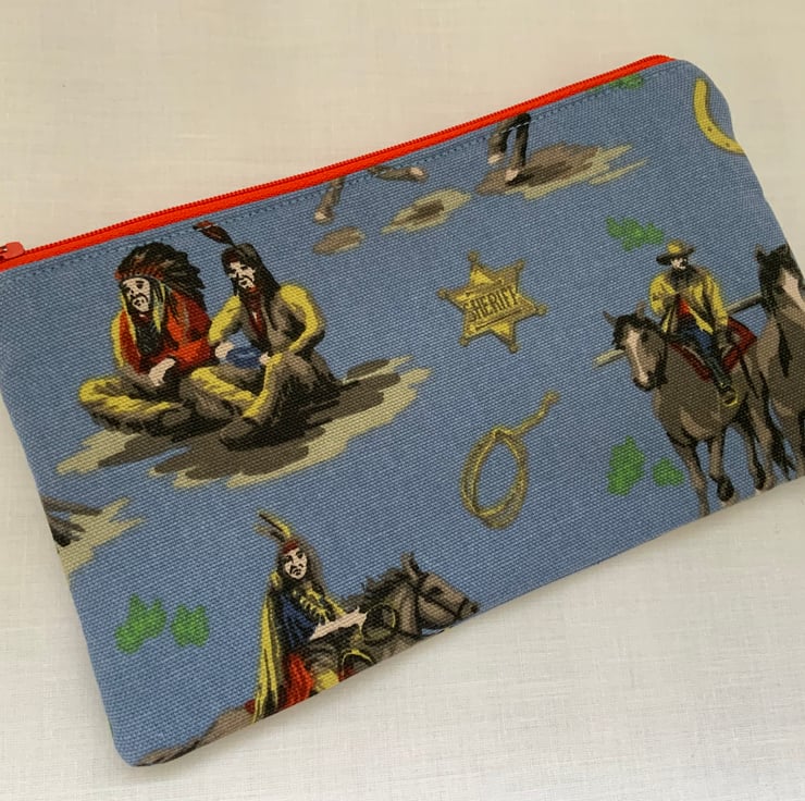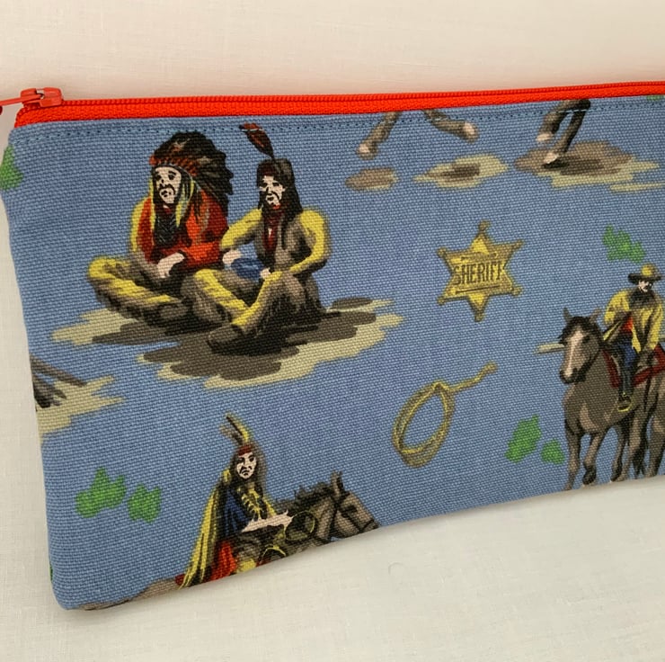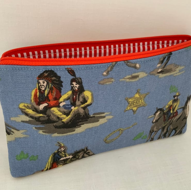 Cute little children’s pencil case made from a 100% cowboy and Indian fabric and lined in stripe cotton.