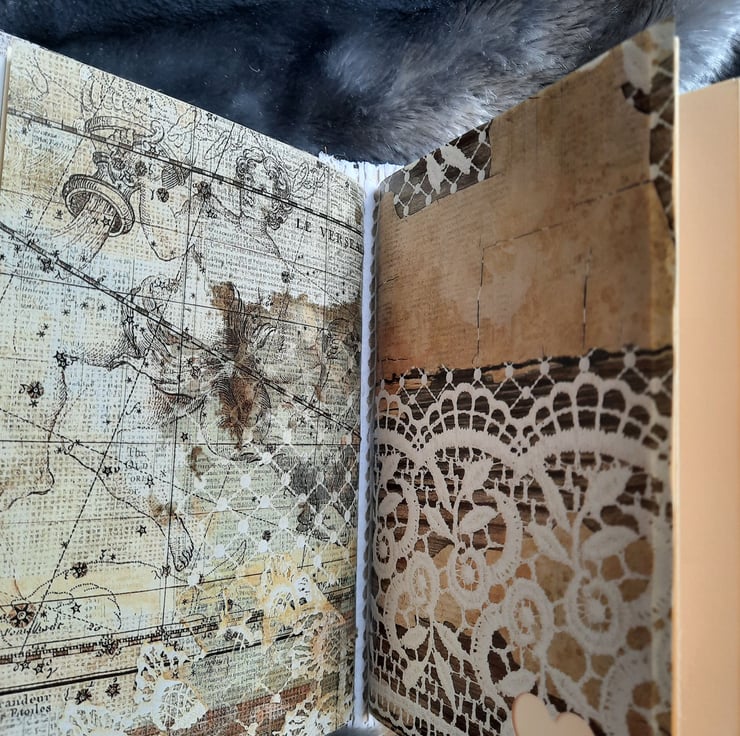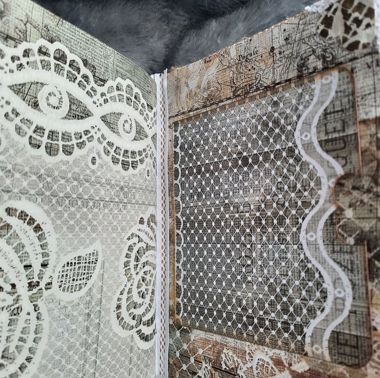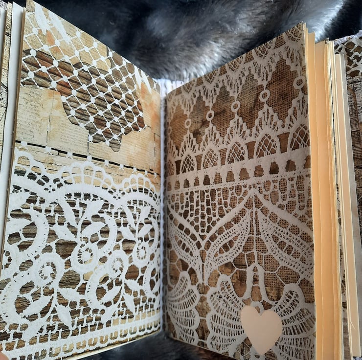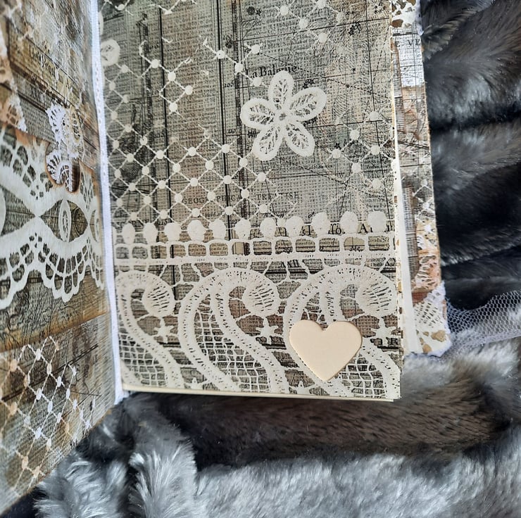 5 signatures of 170 gsm thick paper, each flanked with a lace pattern paper with a cut out heart bottom right
