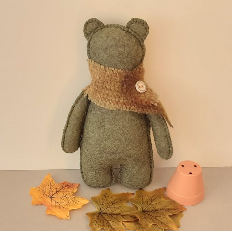 Teddy bear measures approx 8" tall, completely hand sewn from premum 80% wool 20% viscose blended felt in camouflage green.