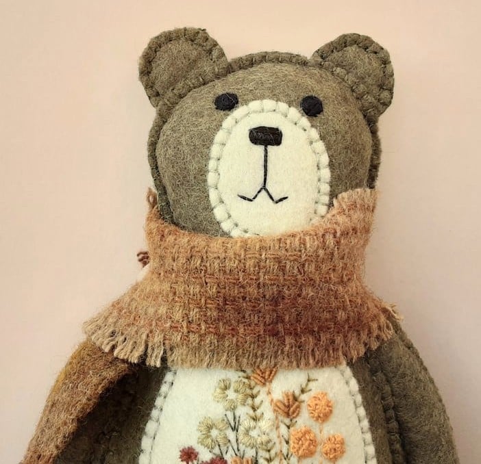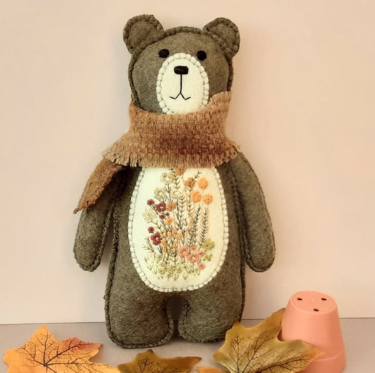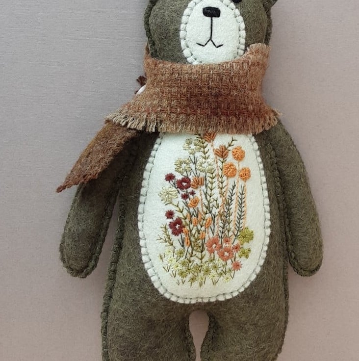 A hand embroidered and hand sewn scandi style woodland teddy bear, designed and created by Bearlescent
