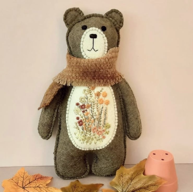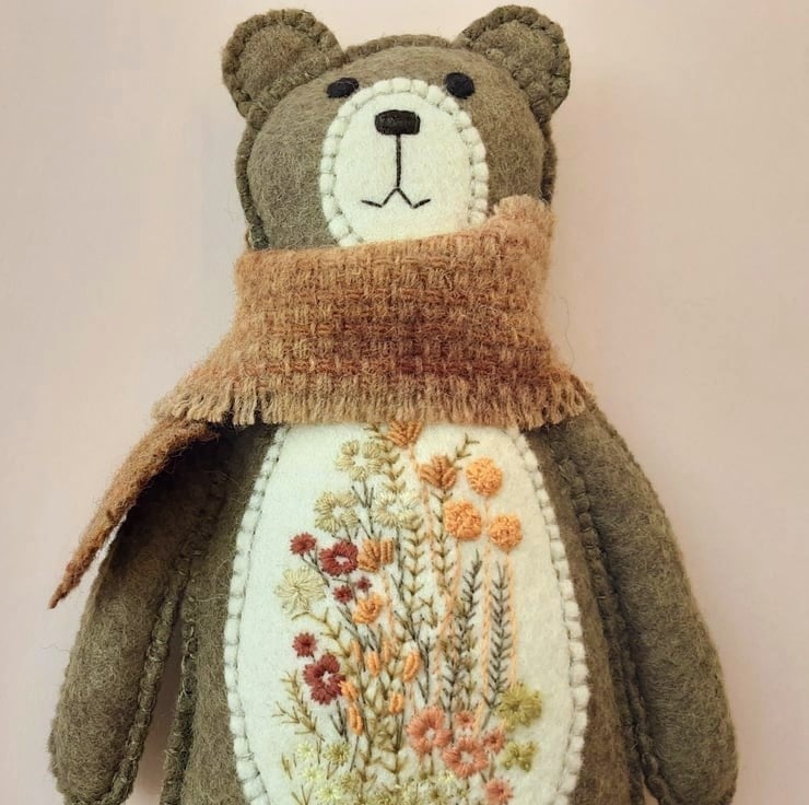 A hand embroidered wool felt teddy bear, designed to give as a keepsake gift.